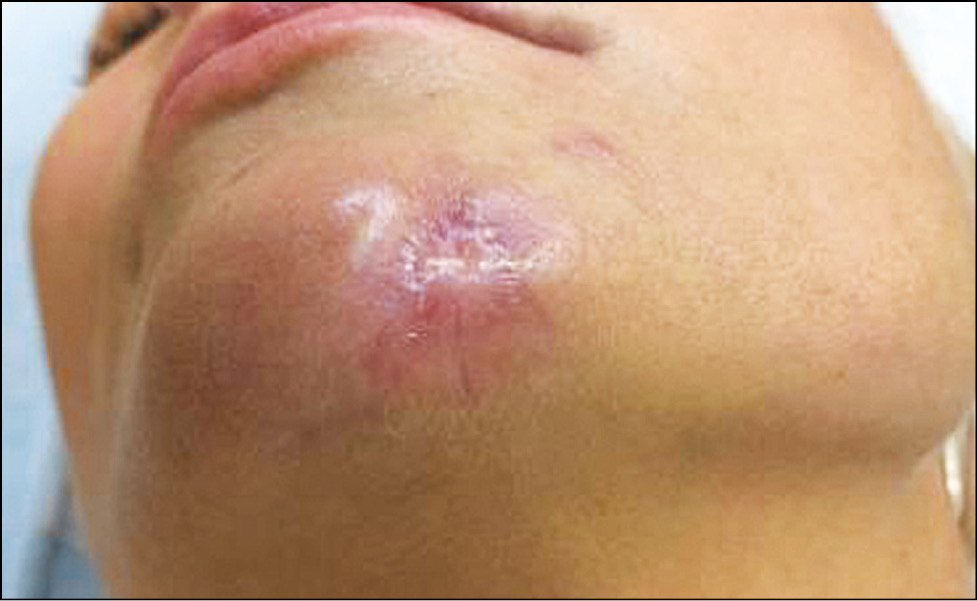 Больная С., 36 лет, по профессии флорист, поступила в нашу клинику с жалобами на болезненный язвенный дефект на подбородке, сопровождающийся зудом. Считает себя больной в течение 5 мес, когда после семейного отдыха в Таиланде обнаружила наличие «красных двигающихся бугорков» на коже подбородка, которые через некоторое время трансформировались в глубокую язву. Дерматовенерологом по месту жительства были назначены эпителизирующие и антибактериальные средства, которые оказались неэффективны, а язвенный дефект продолжал увеличиваться в размерах. Проведённые лабораторные исследования исключили сифилис, туберкулёз, вирус иммунодефицита человека, гепатиты В и С.