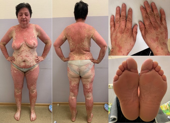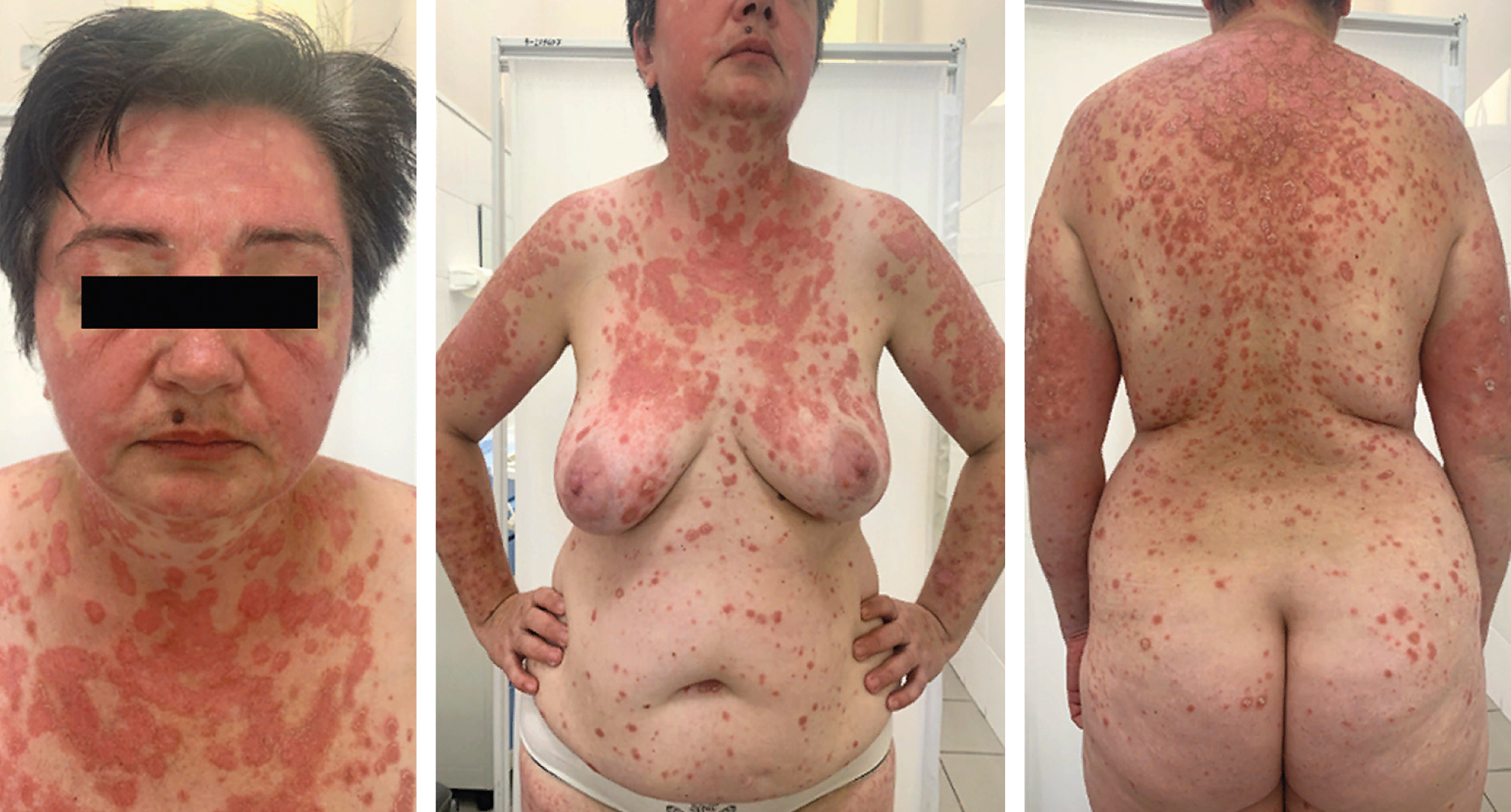 Local status. At the time of admission, the clinical pattern of dermatosis was represented by bright pink erythematous-papular elements, which merged into large plaques with desquamation on the surface. These plaques were localized on the skin of the face, chest, abdomen, back, buttocks, and upper extremities (Figure 1).