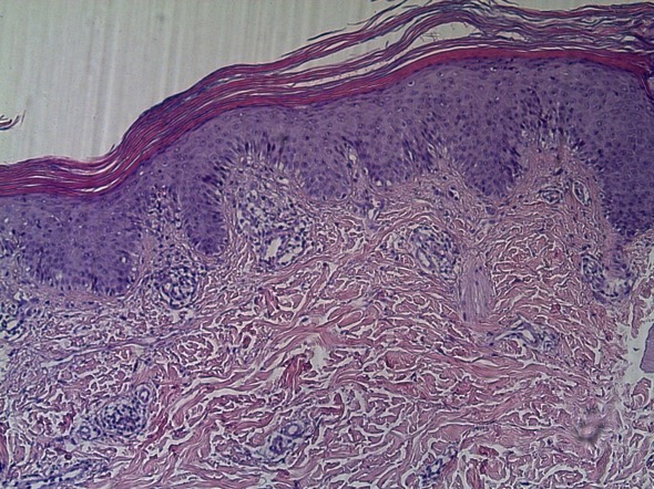 4. Fig. 3. Histological picture: orthokeratosis with areas of parakeratosis; irregular granular layer; irregular broad acantholytic strands; loosened dermoepithelial junction; small lymphomacrophage infiltrates located perivascularly in the dermis.Bon sum modiena