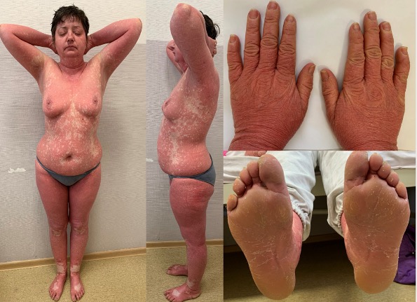 5. Fig. 4. Skin exacerbation after repeated COVID-19 infection: Marked erythroderma with islets of healthy skin.