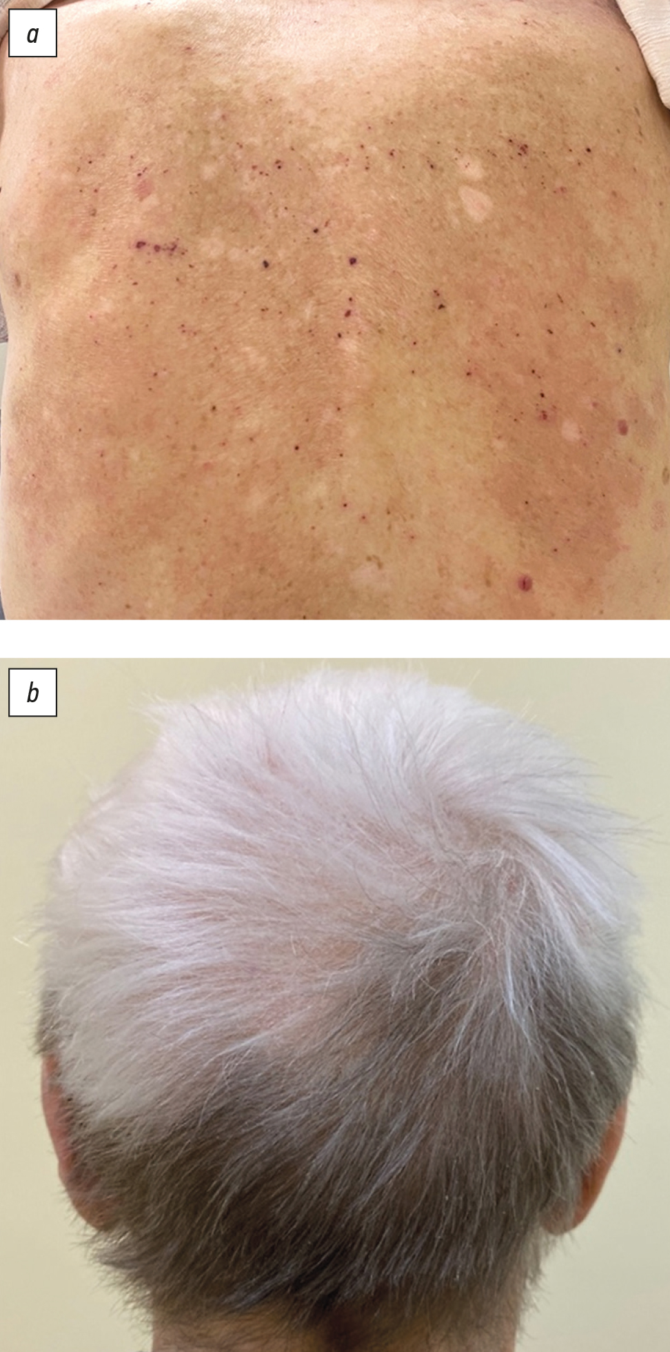 Рис. 8. Витилигоподобная реакция, возникшая при лечении пролголимабом: а ― витилигоподобная депигментация кожи; b ― потеря волосяного пигмента.