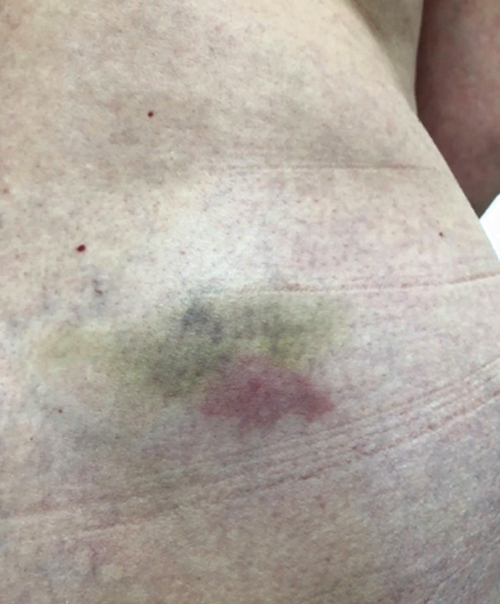 Fig. 2. Resolving urticarial rashes with the formation of hemosiderin staining in a patient with urticarial vasculitis.