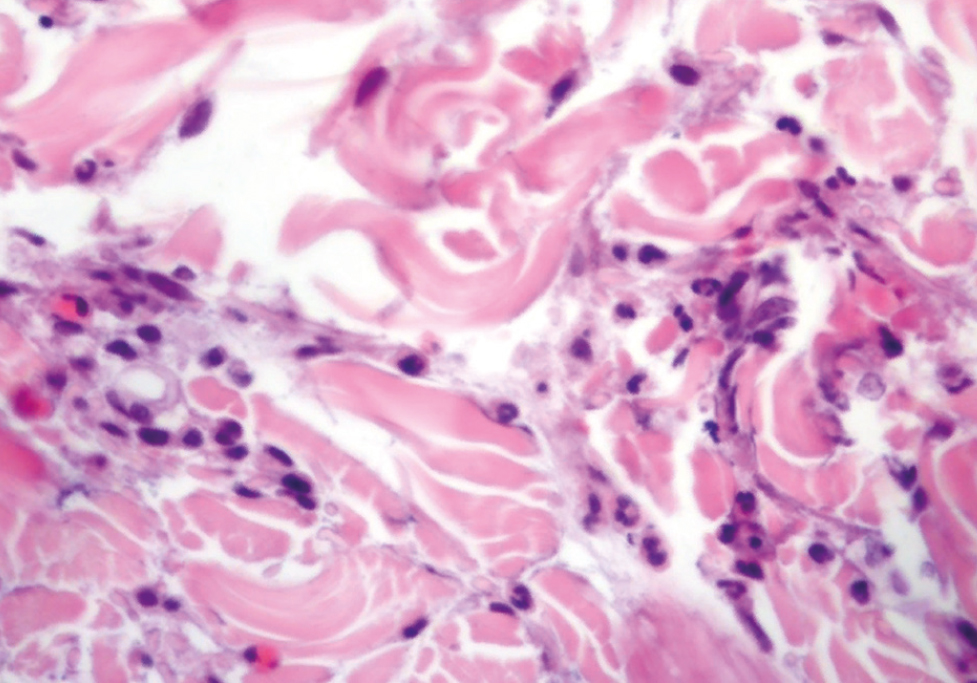 Increased number of mast cells in the dermis | Fibrinoid necrosis with vascular integrity disruption (rare) | Fibrinoid necrosis with vascular integrity disruption | |