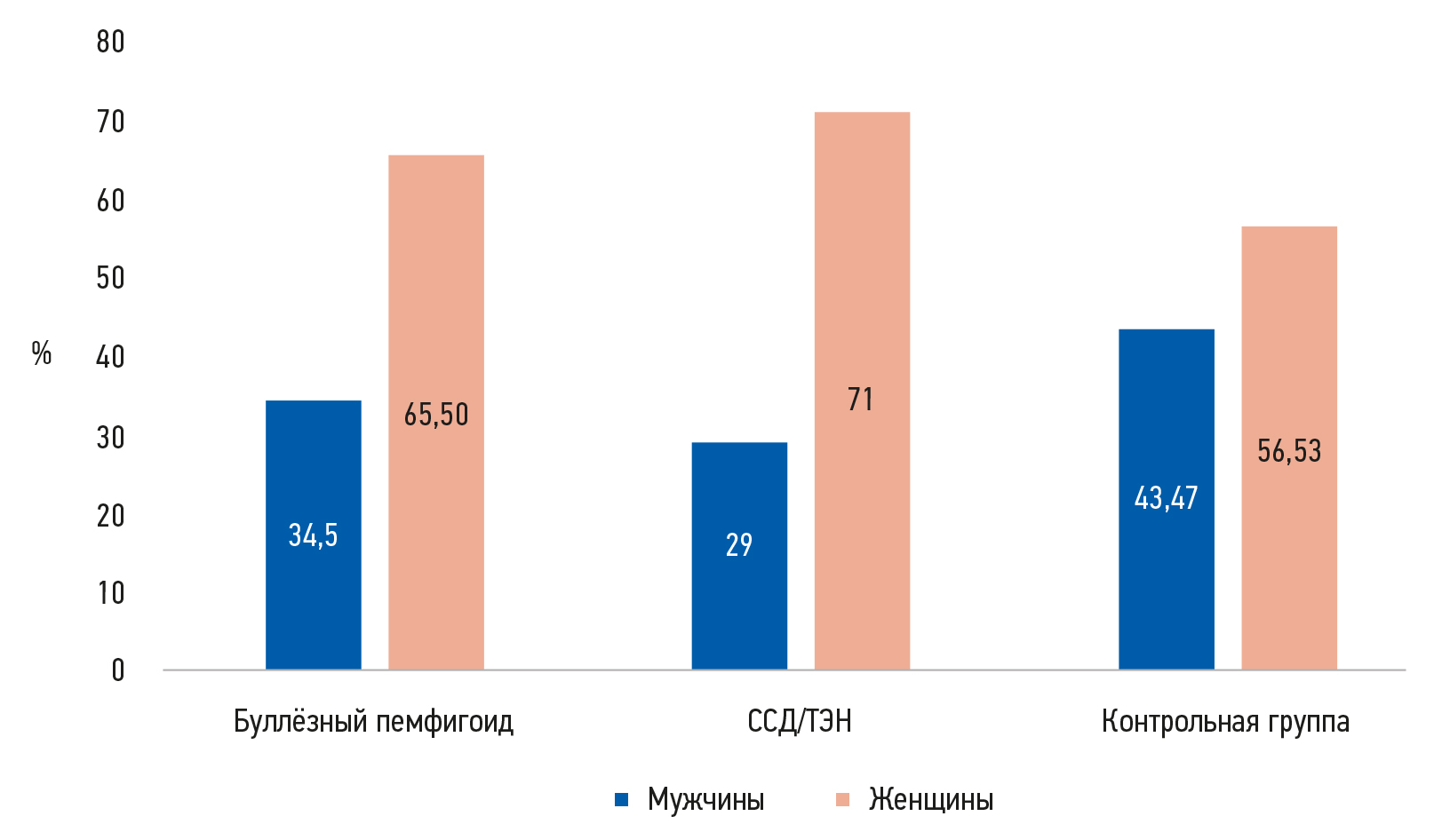 Fig. 1. Distribution of groups of sick and healthy donors by sex. ССД/ТЭН ― Stevens–Johnson syndrome / toxic epidermal necrolysis.