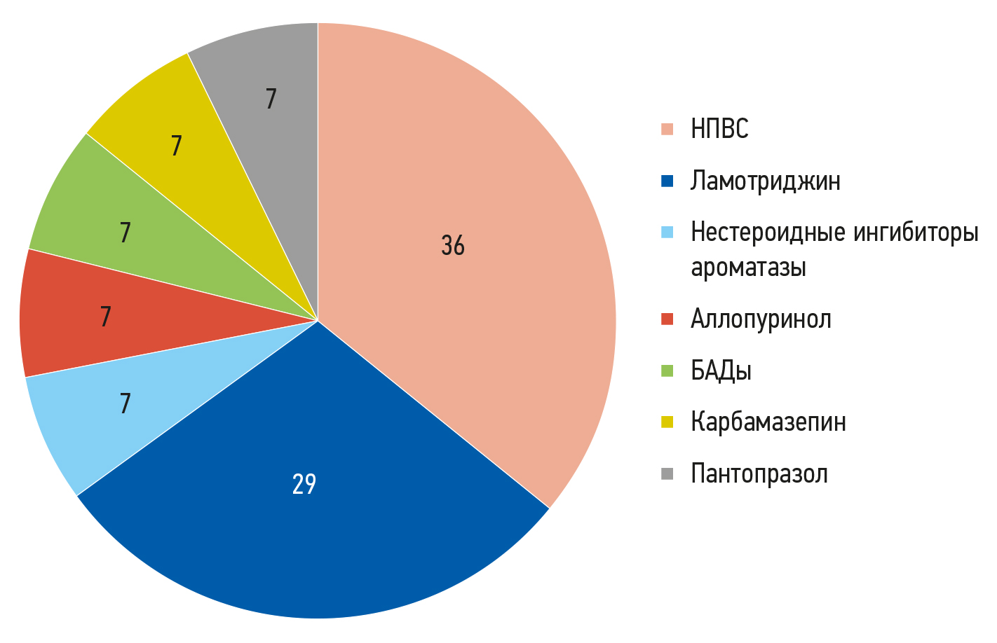 Fig. 2. Distribution of drugs that induced Stevens-Johnson syndrome/toxic epidermal necrolysis (%). НПВС ― non-steroidal anti-inflammatory drugs; БАД ― biologically active supplement.