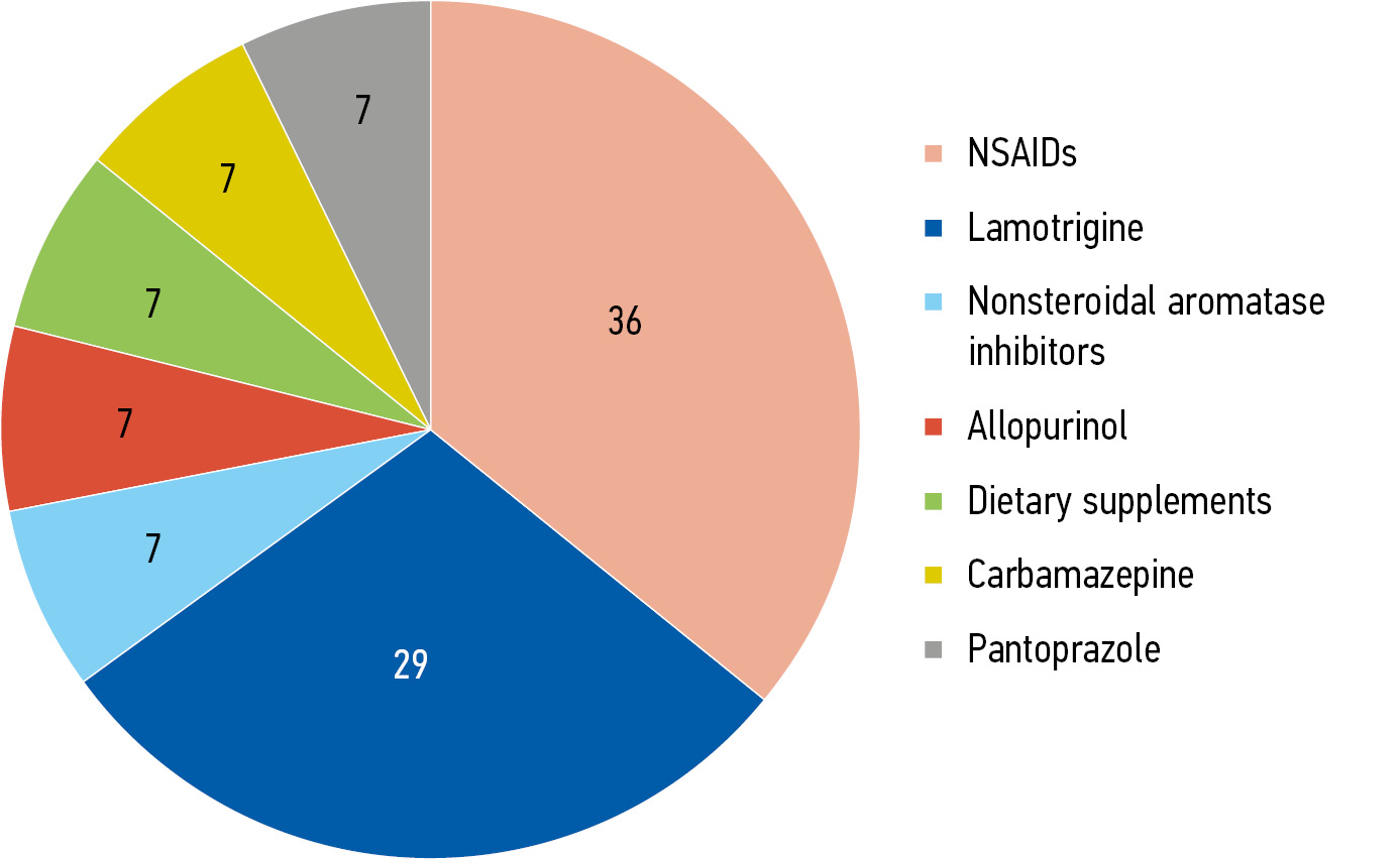 In the bullous pemphigoid group, 19 (65.5%) patients were female, and 10 (34.5%) patients were male. The SJS/TEN group included 10 women (71.4%) and 4 (28.6%) men (Fig. 1). SJS/TEN was caused by nonsteroidal inflammatory drugs in 36% of cases, amotrigine in 29%, and nonsteroidal aromatase inhibitors, allopurinol, dietary supplements, carbamazepine, and pantoprazole in 7% each (Fig. 2). The control group of healthy donors consisted of 40 (43.47%) men and 52 (56.53%) women (Fig. 1). For all diagnoses without exception, women predominate among patients, which may indicate the greater vulnerability of women in these types of dermatoses.