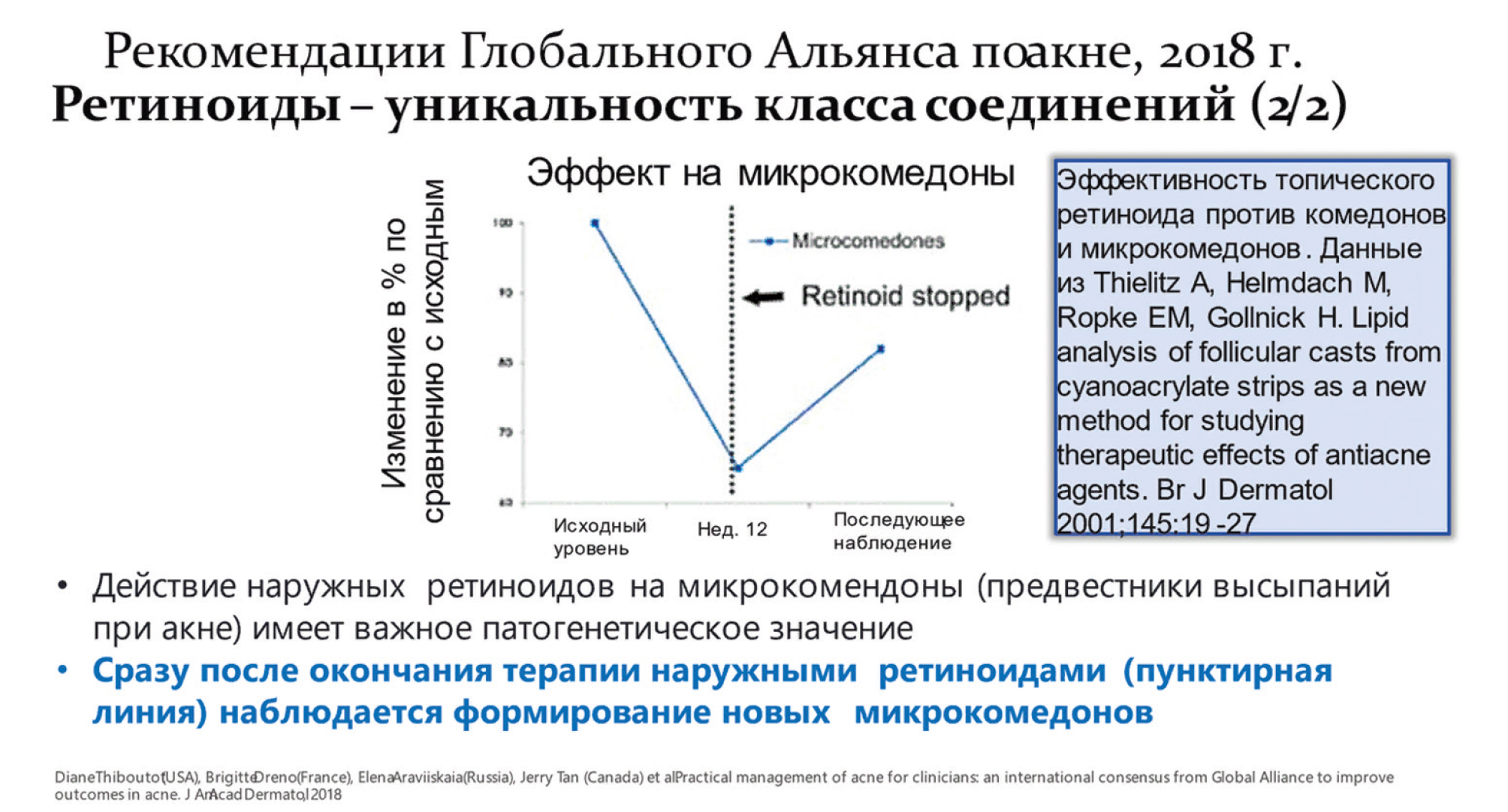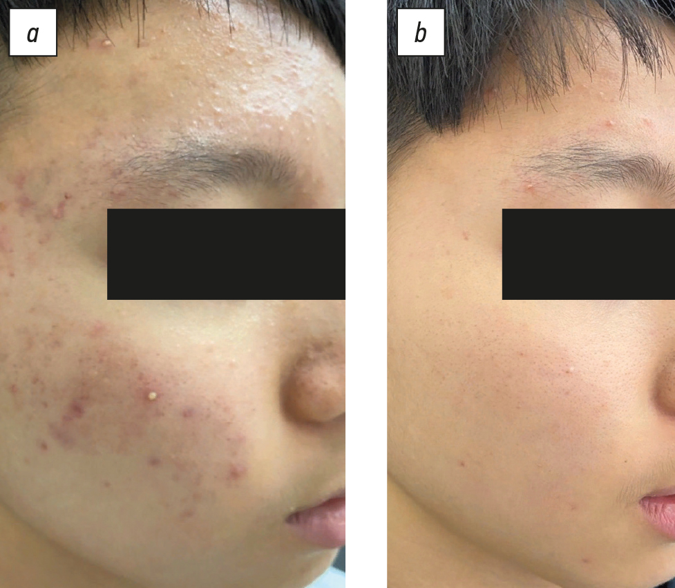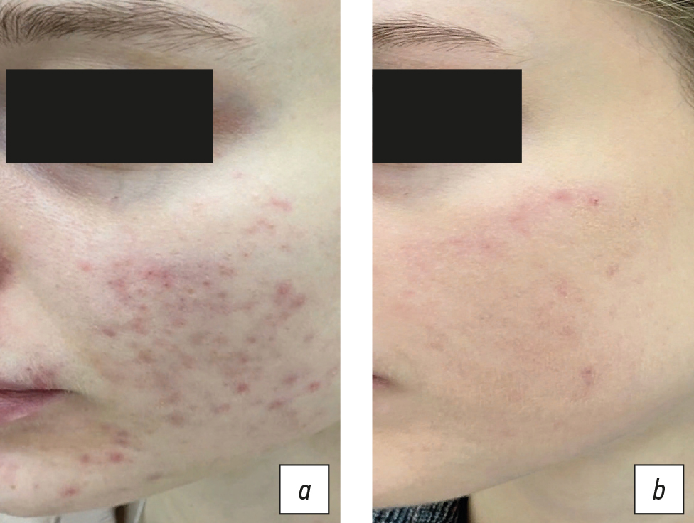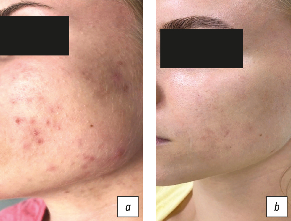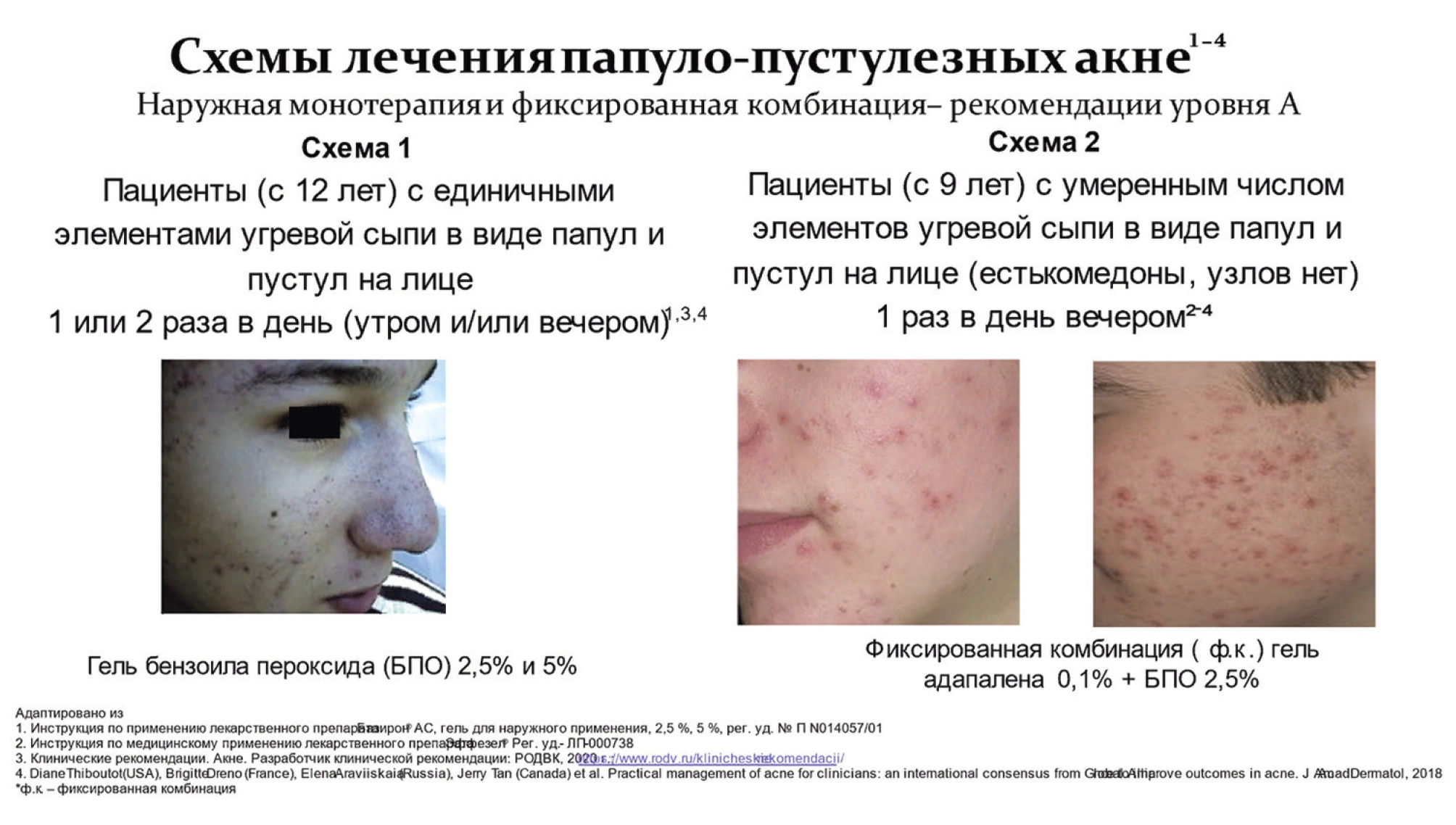 Despite the development of effective methods for treating this dermatosis, patient adherence to treatment remains low. This is due, first of all, to the duration of therapy, not always the rapid achievement of the expected result, and to the development of psycho-emotional disorders in patients. In the latest edition of the Russian Society of Dermatovenerologists and Cosmetologists clinical guidelines for the treatment of mild to moderate acne with a high level of evidence A1, it is recommended to use benzoyl peroxide and a fixed combination of adapalene and benzene peroxide. When prescribing benzene peroxide (Baziron AS), we observed the best results in clearing the skin of rashes in the presence of a few papulopustular elements in the clinical picture due to the triple action of benzoyl peroxide ― antimicrobial, keratolytic and sebostatic. In our experience, it usually took 4 to 6 weeks to achieve clinical remission, and we did not note a single case of the development of bacterial resistance during treatment. For moderately widespread papulopustular acne rashes of moderate severity, as well as in cases of severe forms of the disease, when it is impossible to prescribe systemic isotretinoin or there is a tendency to scarring of the primary elements, we used a fixed combination of adapalene 0.1% and benzoyl peroxide 2.5% (Effezel) with anti-inflammatory, antimicrobial, keratolytic, sebostatic, comedolytic and anticomedogenic effects.