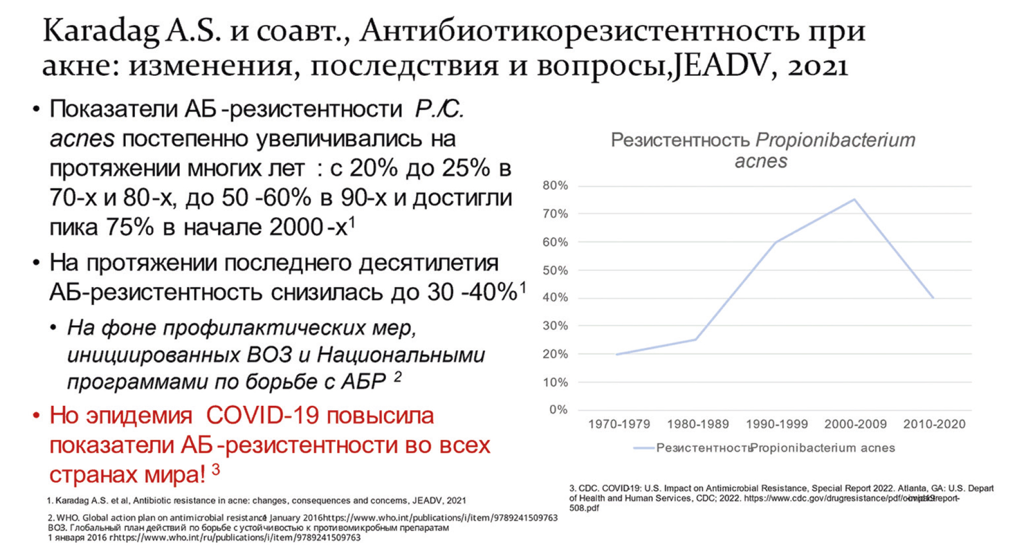 An important point should also be noted regarding antibiotic resistance, which has become a serious problem since the 1980s, when topical and systemic antibiotics of different classes were widely used for the treatment of various dermatoses, including acne. Thus, according to Karadag et al. [37], the global antibiotic resistance was 50%–60% in the 1990s and reached a peak of 75% in the early 2000s. Over the past decade, there has been a notable decline in antibiotic resistance rates, largely due to the implementation of preventive measures by the World Health Organization4 and national programs designed to combat antibiotic resistance. However, the COVID-19 pandemic has led to a resurgence of antibiotic resistance globally5 [38] (Figure 3).