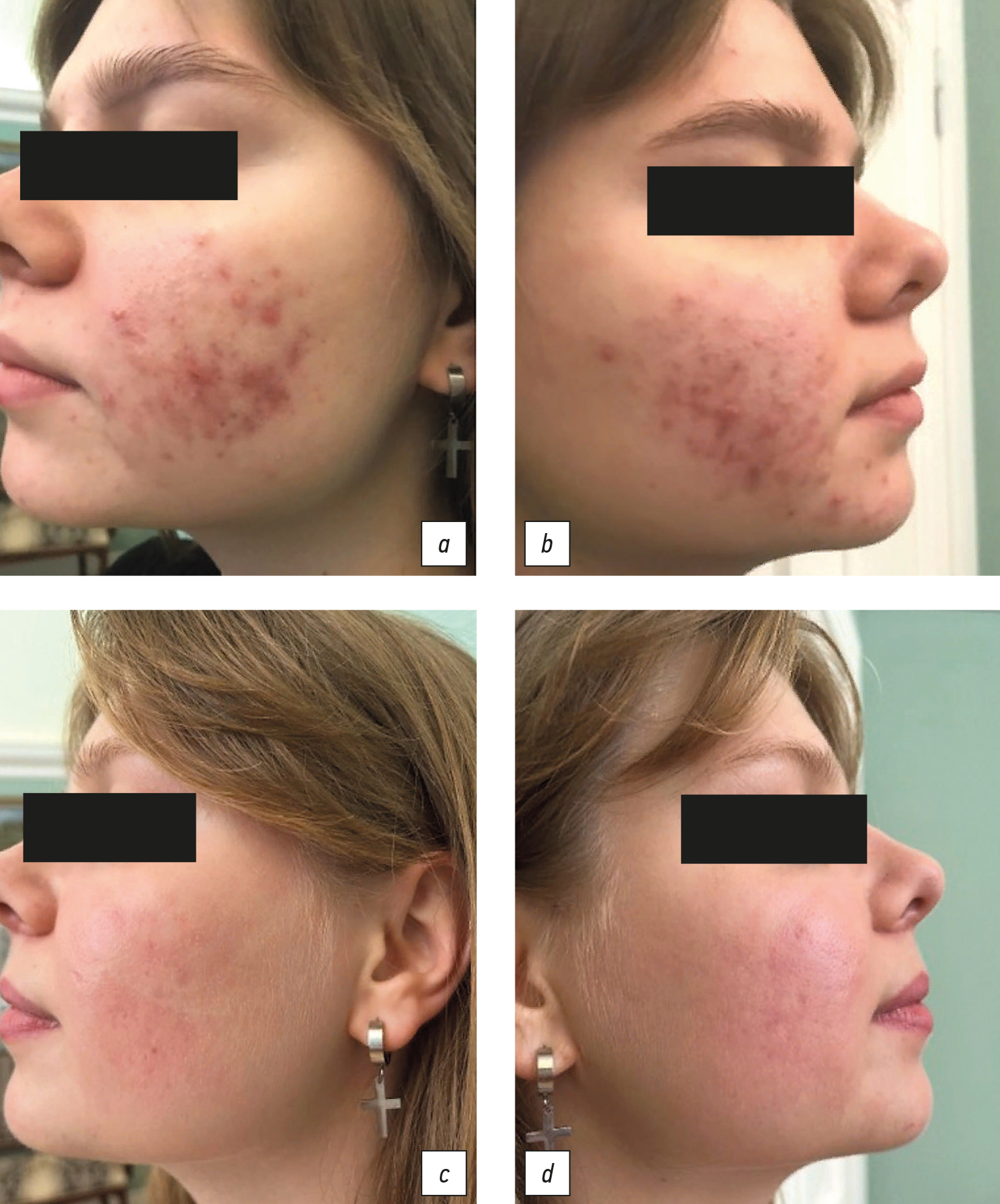 The Clinic for Skin and Venereal Diseases of the Sechenov University Clinical Hospital No. 2 has gained extensive experience in the treatment of acne. In the Treatment and Diagnostic Department, patients with mild to moderate acne are consulted and treated almost daily. As a rule, these are young patients, but 10%–15% of patients are diagnosed with late acne. Dermatological examination is performed visually with simple counting of rashes (papules, pustules, and nodules), which is used to determine the severity. In accordance with the guidelines, external therapy is the primary course of treatment for cases of mild acne. For moderate acne, topical agents are used along with antibiotics (doxycycline or minocycline) or hormonal preparations (as indicated). Patients with severe forms of acne receive systemic retinoids in conjunction with corrective therapy until a specified cumulative dose is reached, after which they are treated with external supportive therapy on an intermittent schedule for 12 months. This helps to prevent aggravation and scarring in post-acne conditions and smooth the skin surface with existing atrophic scars. The results of our own observations are illustrated (Figures 4–9).