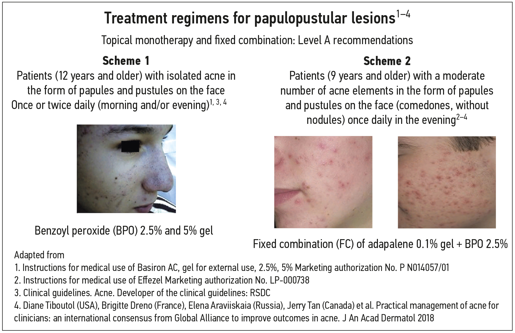 In the guidelines of the Russian Society of Dermatovenereologists and Cosmetologists (RSDC) for the treatment of mild and moderate papulopustular acne, benzoyl peroxide and fixed combination of adapalene and benzoyl peroxide have the highest level of evidence and grade of recommendation, classified as A1 (Figure 1). A clinically noticeable therapeutic effect of benzoyl peroxide is observed after four weeks, with a persistent result achieved after three months of treatment. Significant improvement in therapy with the fixed combination of adapalene/benzoyl peroxide is evident after one to four weeks2 [10, 18].