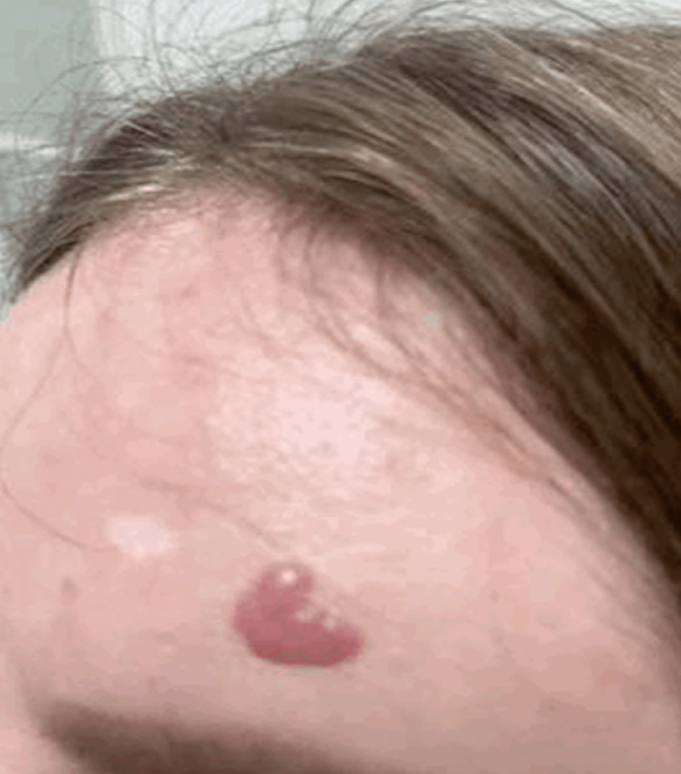 Fig. 1. Patient P., 29 years old. A horseshoe-shaped burgundy-red nodule of 3×2 cm in size, painless, dense-elastic consistency, with a smooth surface was located on the skin of the forehead on the left side.