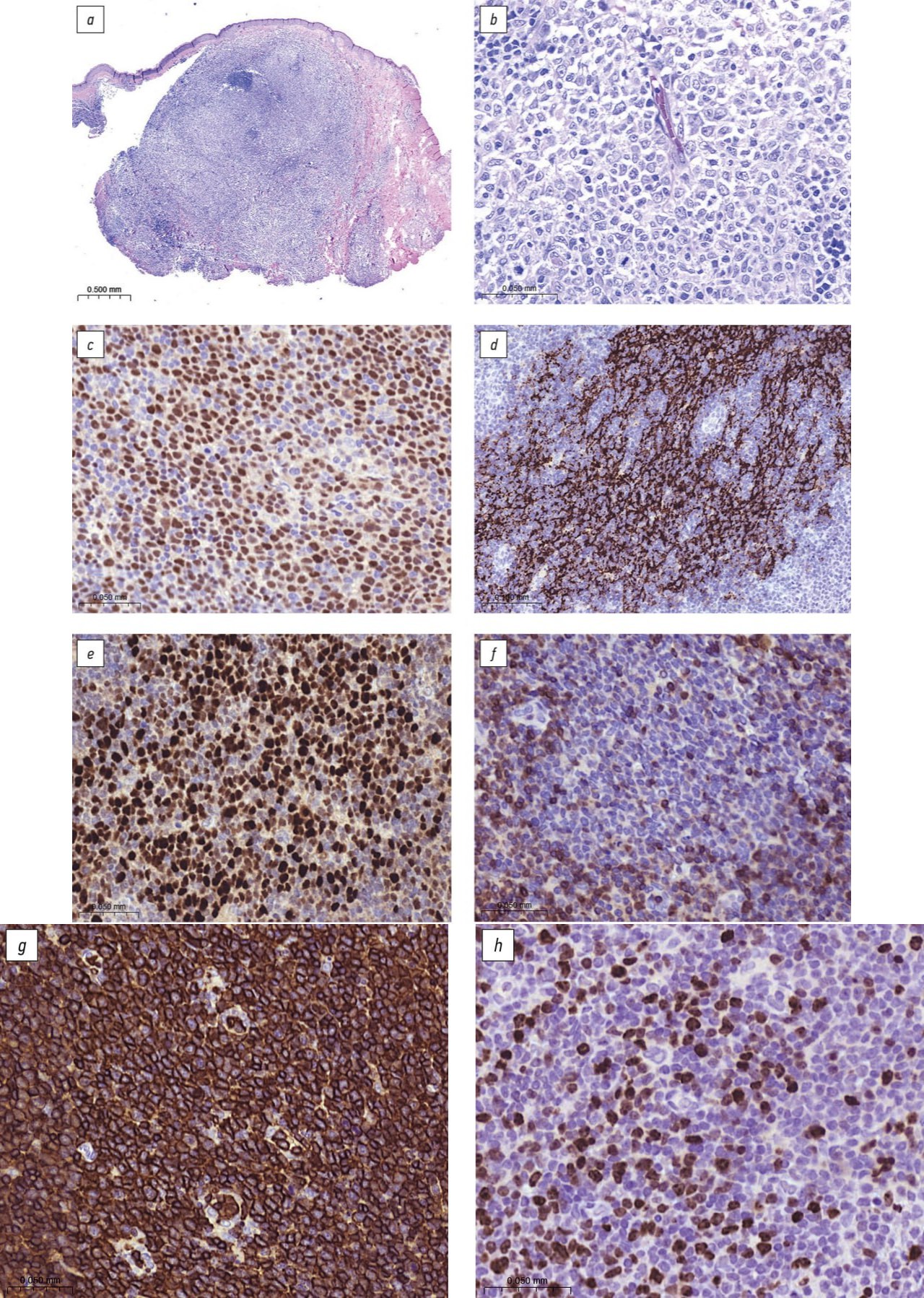 3. Fig. 2. Results of histological and immunohistochemical examination: a ― overview view of skin preparation with nodular proliferate tumour lymphoid cells; b ― predominantly centrocytic composition of nodular tumour proliferates with admixture of a small number of centroblasts; c ― nuclear expression of bcl6 by tumour cells; d ― dislocated network of follicular dendritic cells expressing CD23 at the base of tumour proliferates; e ― nuclear expression of LMO2 by tumour cells; f ― tumour cells do not express bcl2; g ― expression of CD20 by tumour cells; h ― expression of Ki67 nuclear protein by tumour cells.