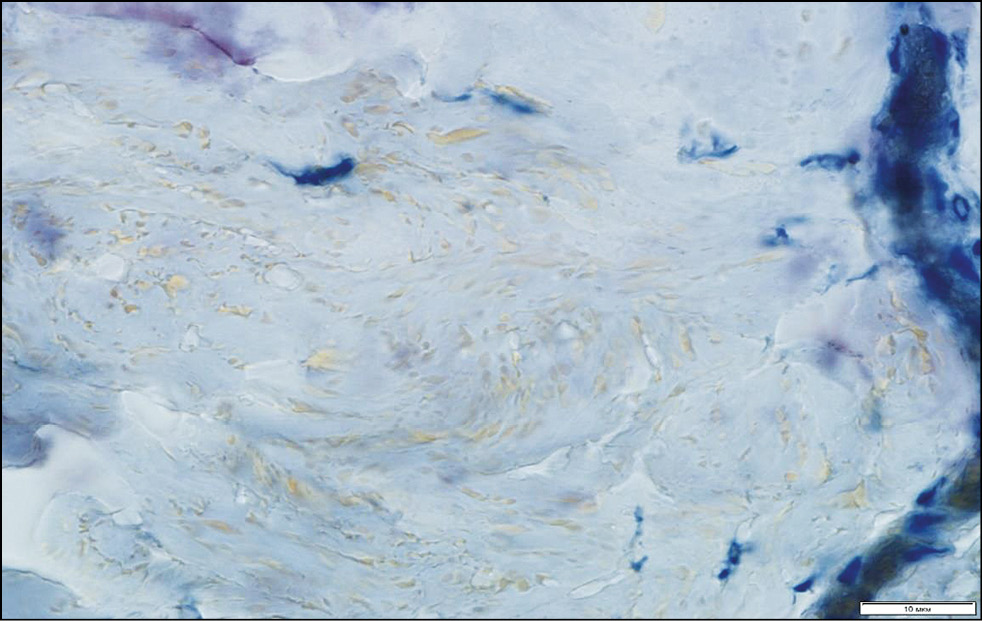 При оценке результатов иммуногистохимического исследования маркера коллагена I типа полуколичественным методом до курса процедур получена экспрессия в 2 балла, после курса ФДТ ― 4 балла, для коллагена III типа ― 4 и 2 балла соответственно.