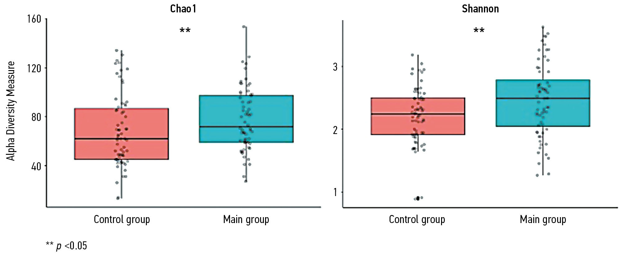 - Alpha diversity using the estimate_richness function of the phyloseq package (v 1.40.0): the significance of the between-group difference was determined by the Wilcoxon T-test, and the null hypothesis was rejected at p-value < 0.05.