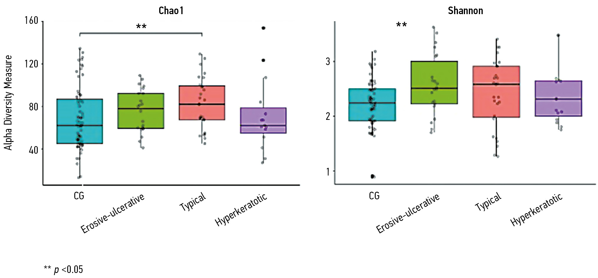 Fig. 2. Alpha diversity measurement of bacterial composition of oral cavity according to the form of the oral lichen planus disease using Chao1 and Shannon Index.