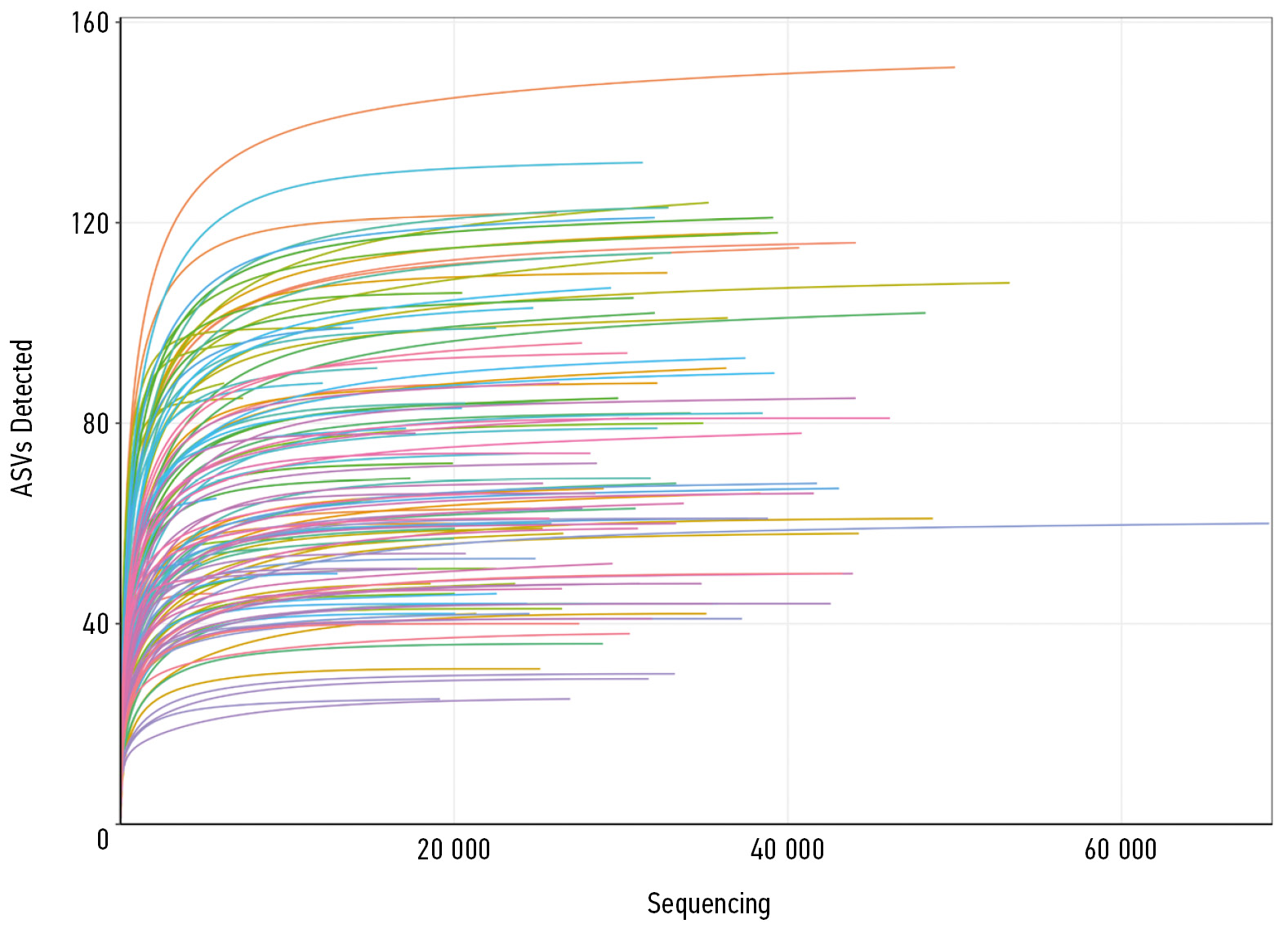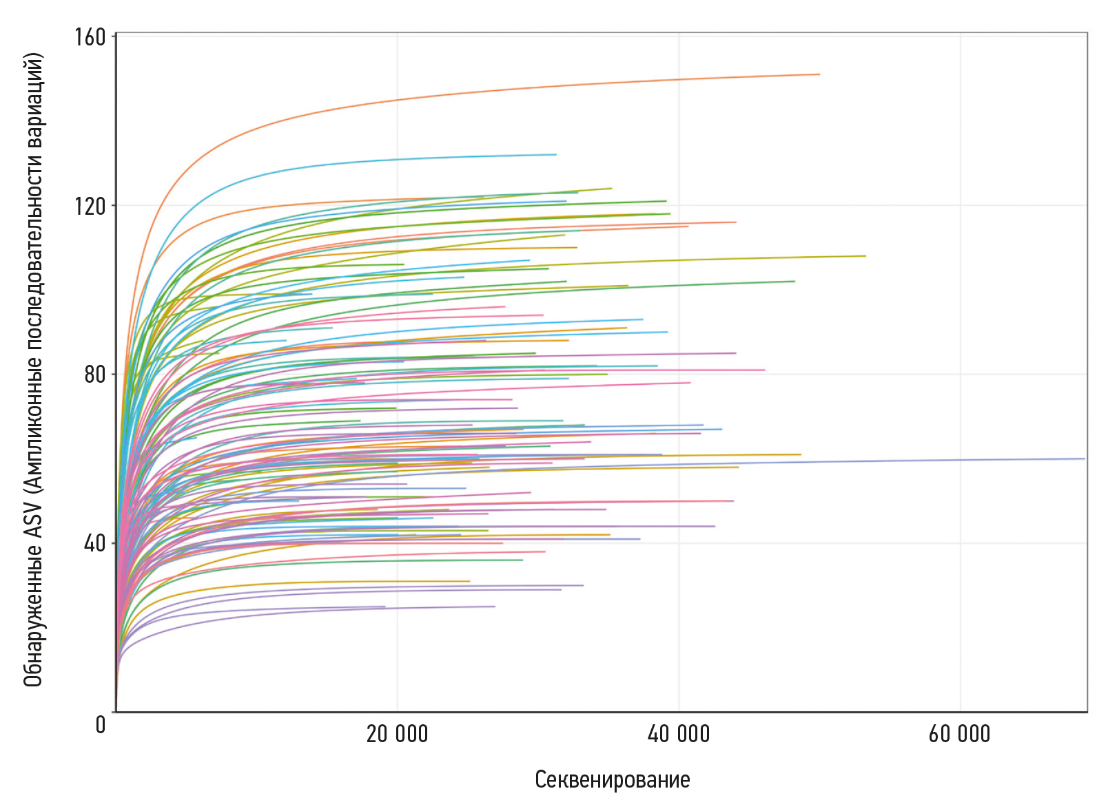 Sequencing resulted in 7956–121,460 reads per sample. After filtering and removing chimeric sequences, the analysis included 4,874–68,898 reads per sample. Data were processed in the R programming language (v 4.2.0) using the dada2 package (v 1.24.0). A rarefaction curve of amplicon sequence variants (ASV) was plotted, and most samples became saturated at 10,000 reads.