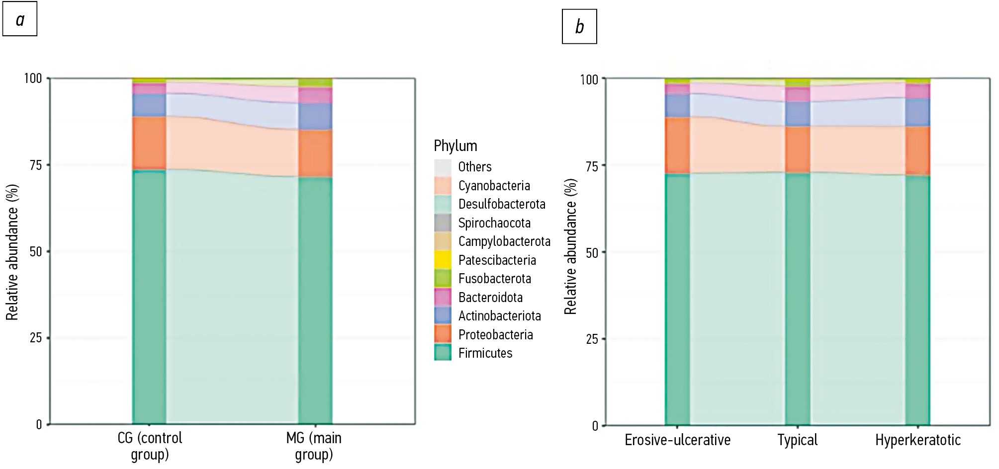 5. Fig. 4. Representation of the relative abundance of oral microbiota at the phylum level with comparisons between the main group (О-Г) and control group (К-Г) (a), as well as among the typical, erosive-ulcerative, and hyperkeratotic forms (b) (The 10 more frequent taxa).