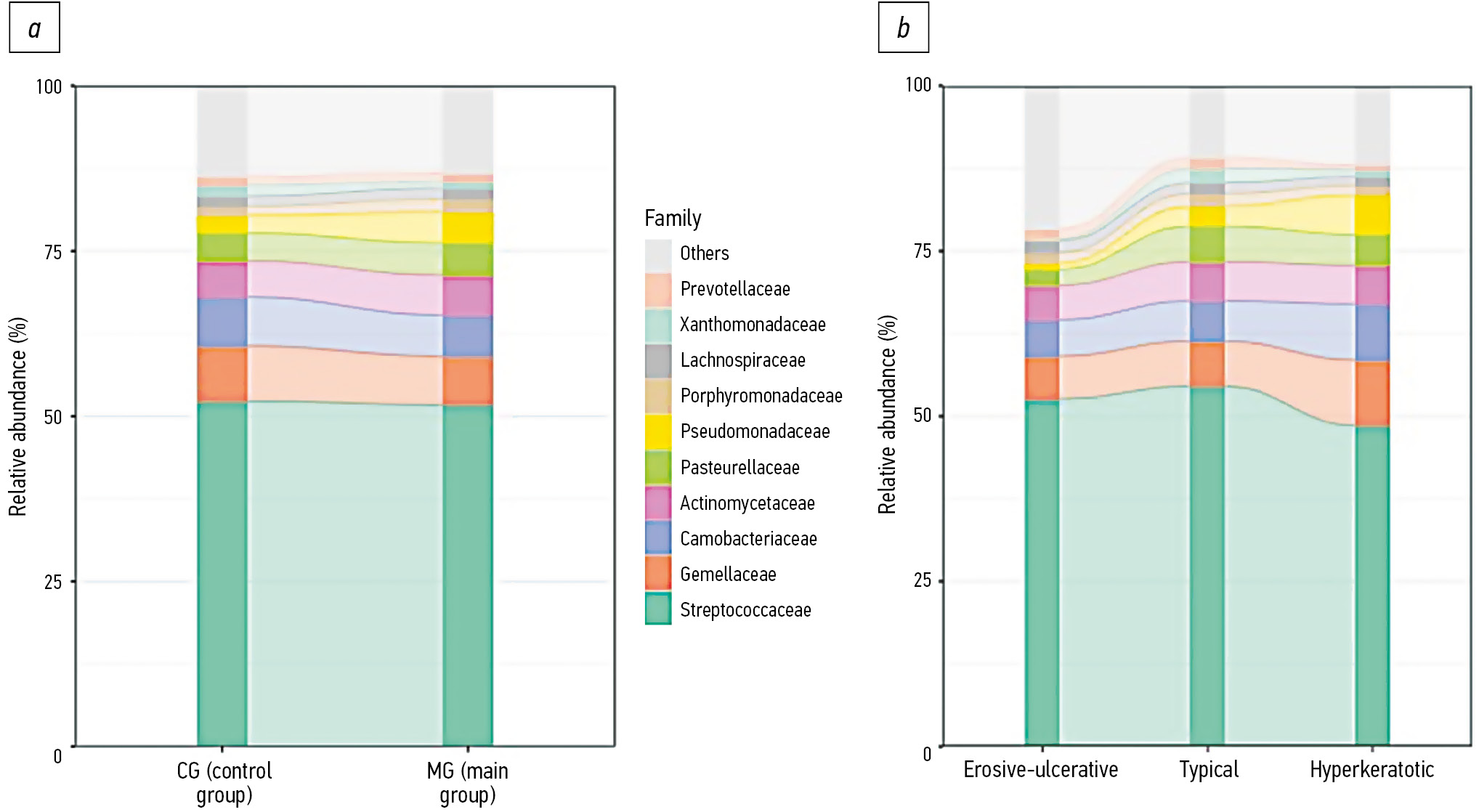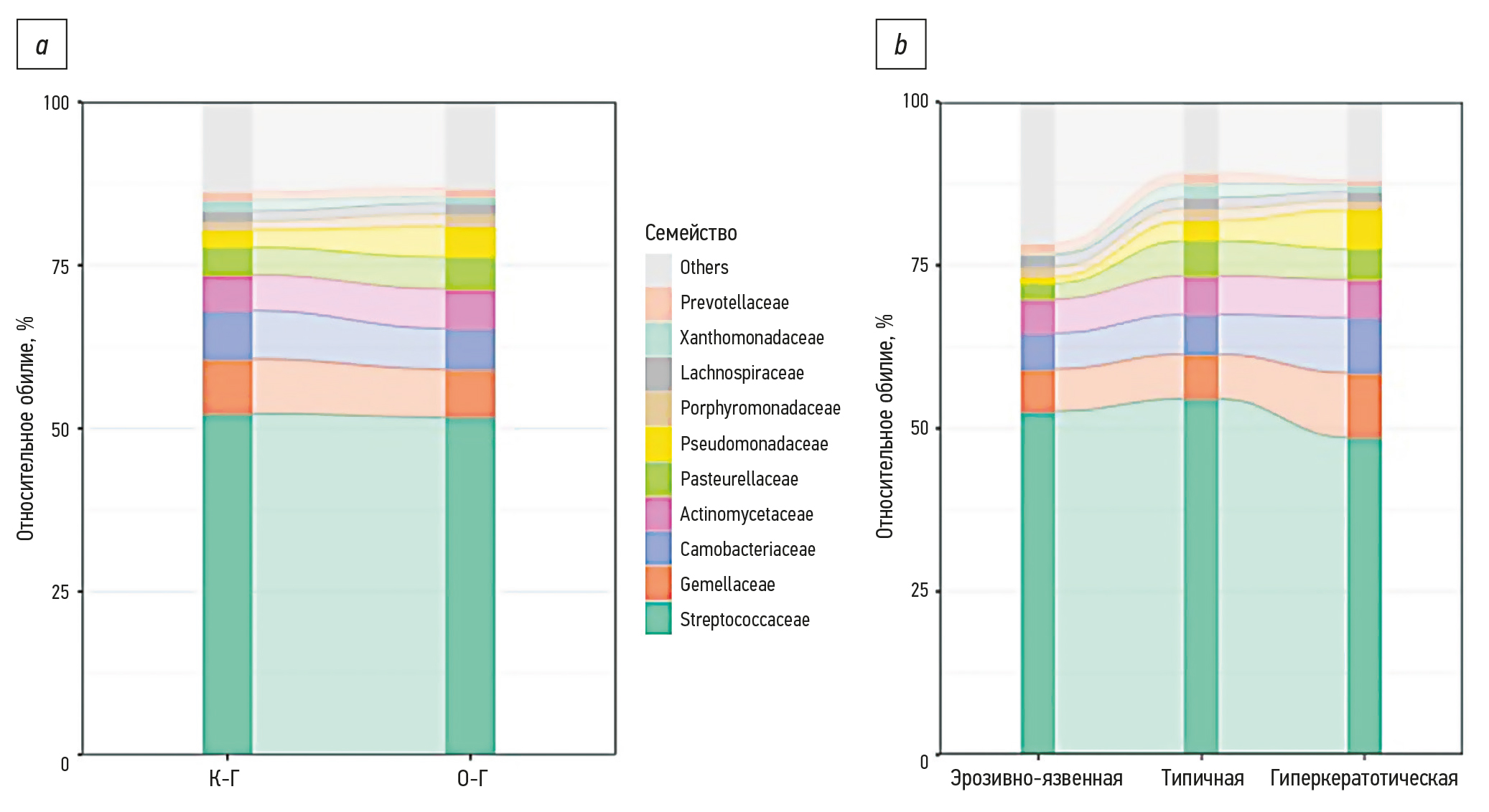 Fig. 5. Representation of the relative abundance of oral microbiota at a family level with comparisons between the main group (О-Г) and control group (К-Г) (a), as well as among the typical, erosive-ulcerative, and hyperkeratotic forms (b) (The 10 more frequent taxa).