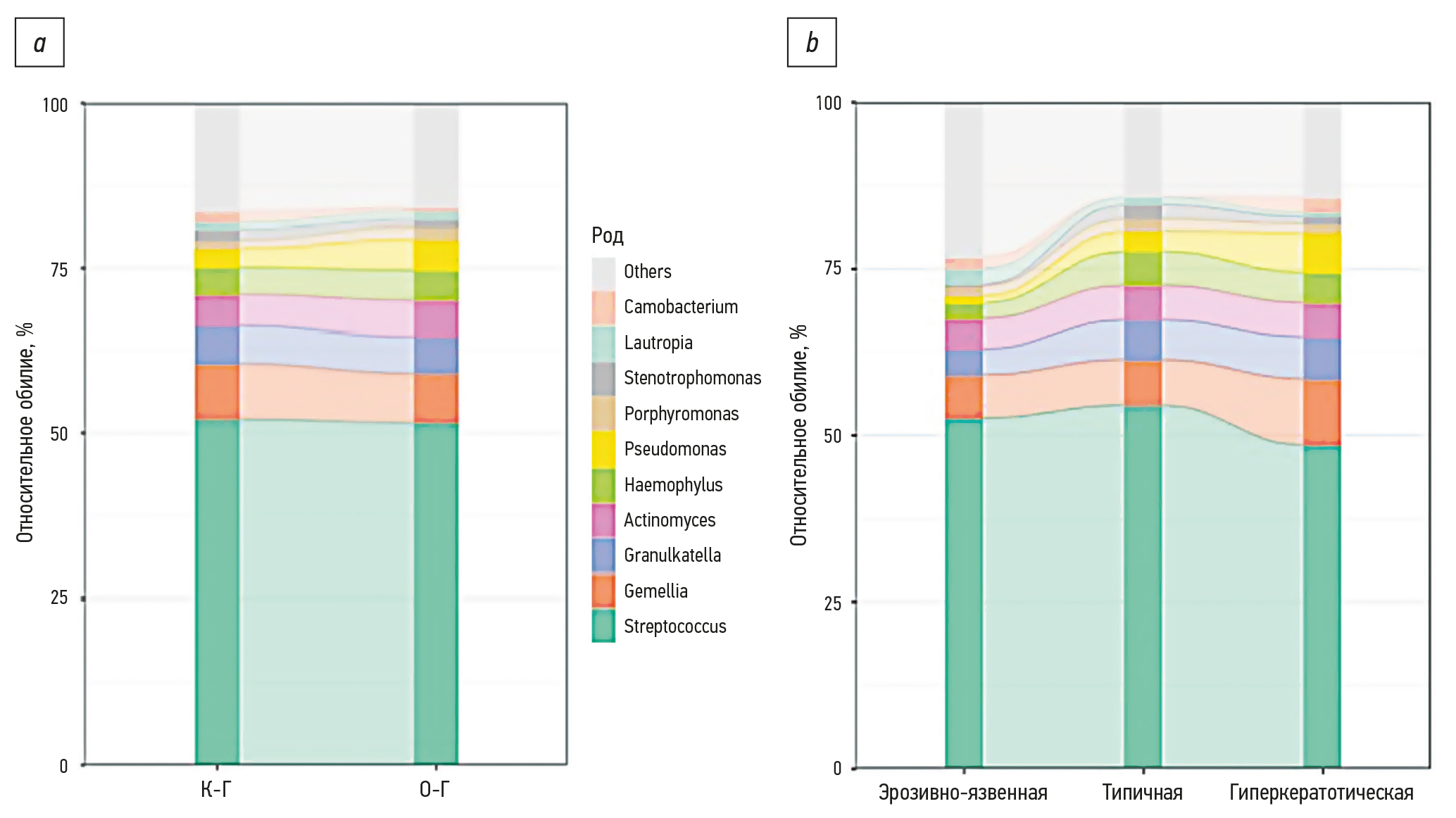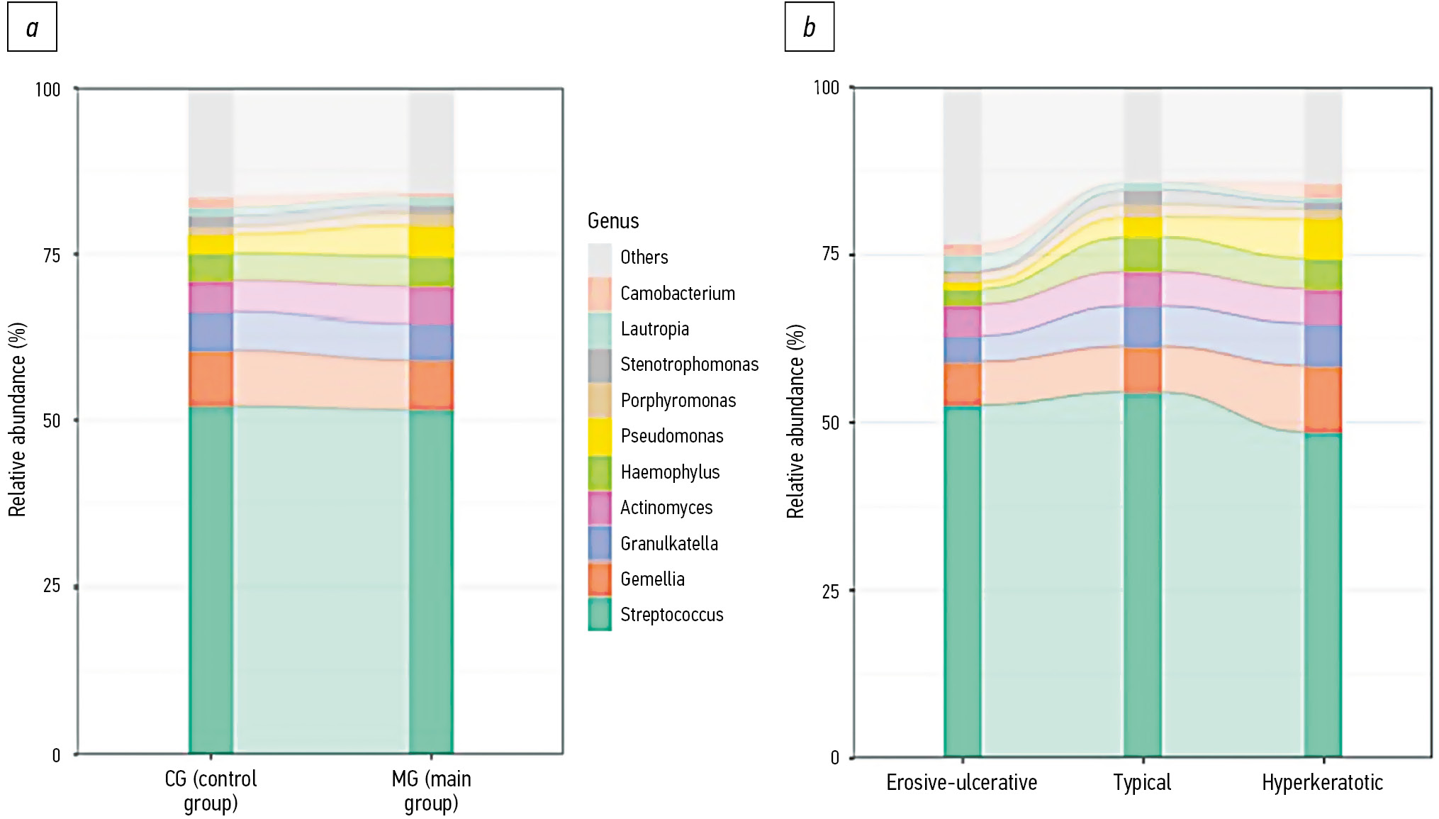 7. Fig. 6. Representation of the relative abundance of oral microbiota at a genus level with comparisons between the main group (О-Г) and control group (К-Г) (a), as well as among the typical, erosive-ulcerative, and hyperkeratotic forms (b) (The 10 more frequent taxa).
