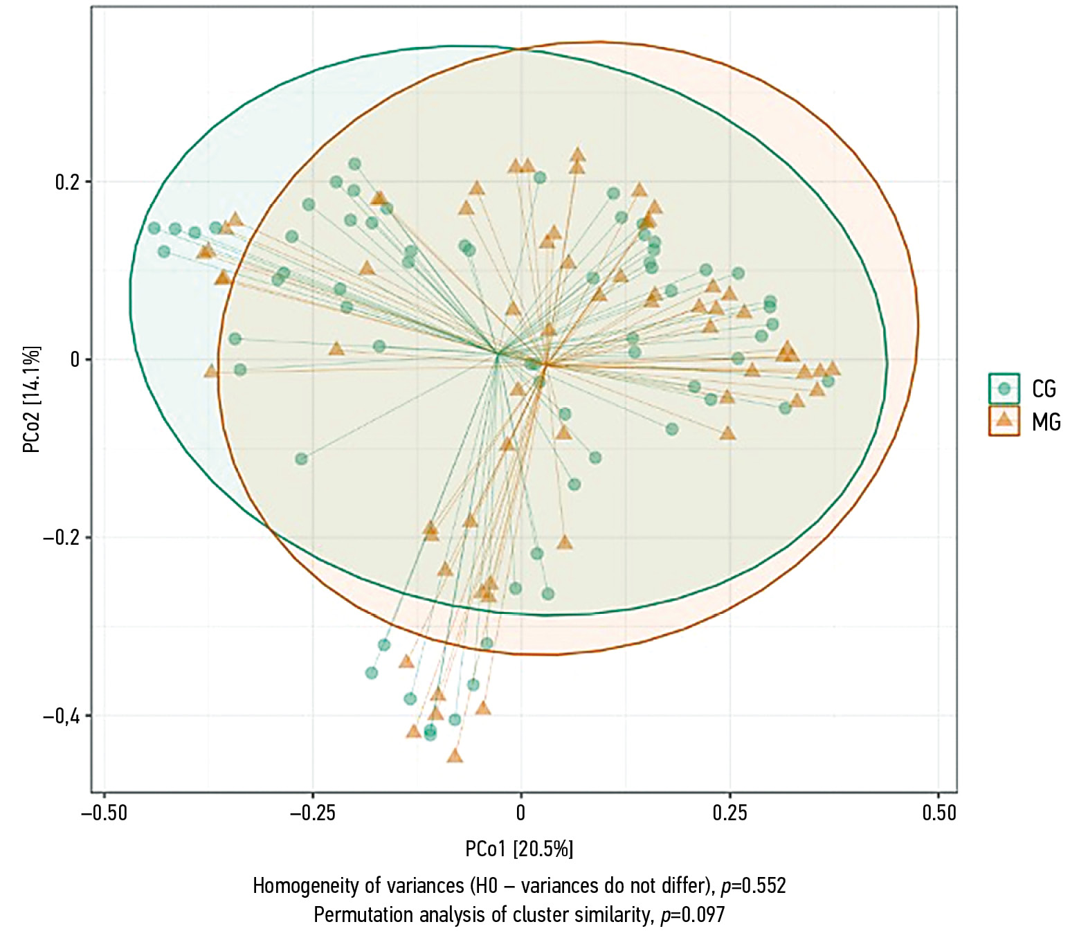 In contrast to alpha diversity measures, which demonstrated differences in the oral microbiota of the main group compared with the control group, the analysis of beta diversity did not reveal significant differences between the groups. Thus, while the microbiota composition (beta diversity) remains essentially similar between the study groups, the diversity and abundance of individual species (alpha diversity) differ, indicating specific changes in the microbial community, associated with oral health.