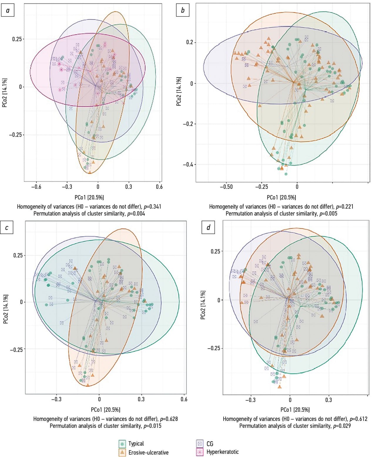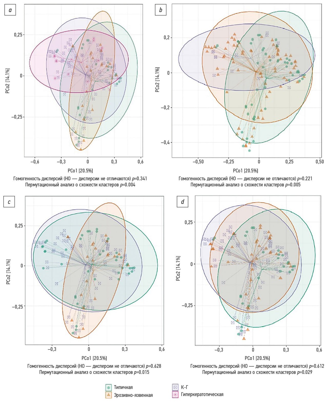 Beta diversity analysis. The calculation of beta diversity did not reveal any differences between the main group and the control group (Fig. 7); however, when compared by disease form, significant differences were recorded (Fig. 8). In particular, the typical and hyperkeratotic forms were clearly grouped (Fig. 8b), as well as the erosive-ulcerative and hyperkeratotic forms (Fig. 8d) with p values of 0.628 and 0.612, respectively. This finding suggests that the typical form demonstrates more significant differentiation in the structure of the microbiome compared with the hyperkeratotic and erosive-ulcerative forms.
