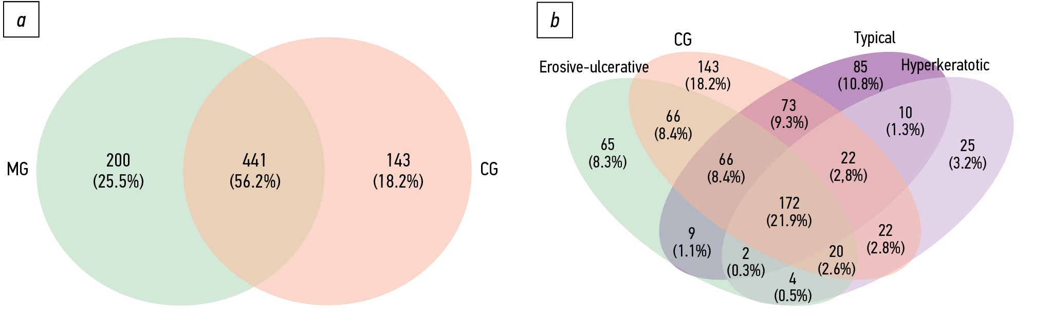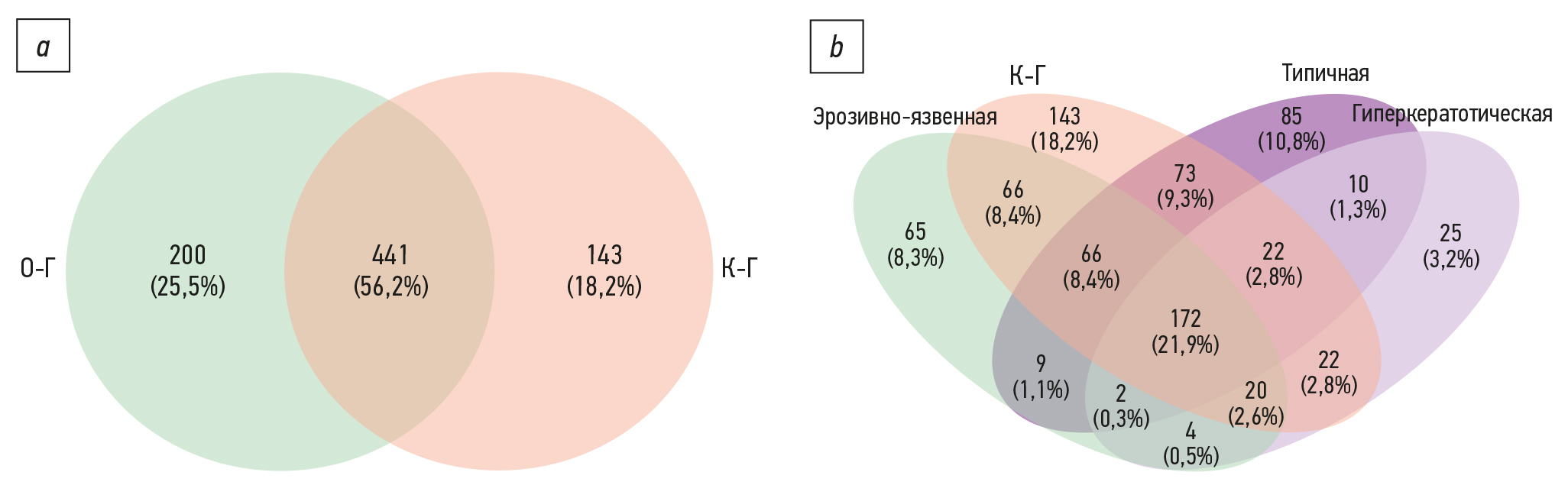 Fig. 9. Venn diagram representation of the main (О-Г, oral lichen planus patients) and control (К-Г) group (a) and according to clinical form (b).