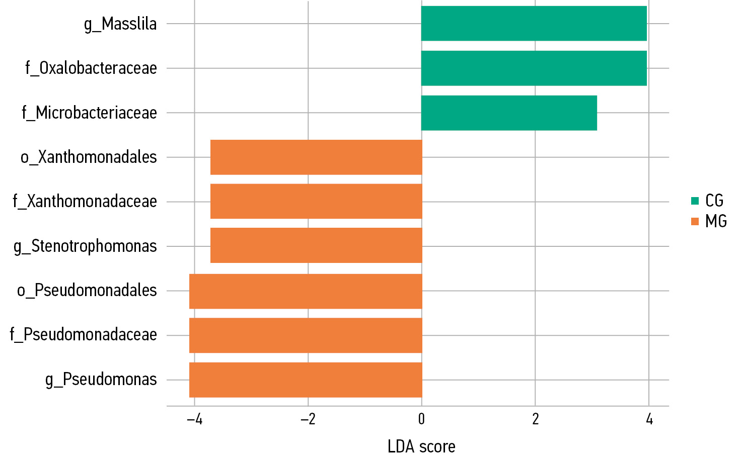 Detailed (linear discriminant) analysis revealed unique bacterial taxa characteristic of the main group; thus, Pseudomonas, Pseudomonadaceae, and Pseudomonadales deserve special attention because of their high ecological resistance and potential for opportunistic pathogenicity. The increase in their abundance in patients with OLP suggests possible pathogenic changes in the oral microbiota composition [9]. Stenotrophomonas, Xanthomonadaceae, and Xanthomonadales are also of concern because of antibiotic resistance and infections, which, given their dominance in the main group, indicates dysbiosis associated with the disease [10]. Finally, Massilia, Oxalobacteraceae, and Microbacteriaceae, which are less dominant in the oral cavity, may represent commensal bacteria characteristic of a healthy oral microbiome.
