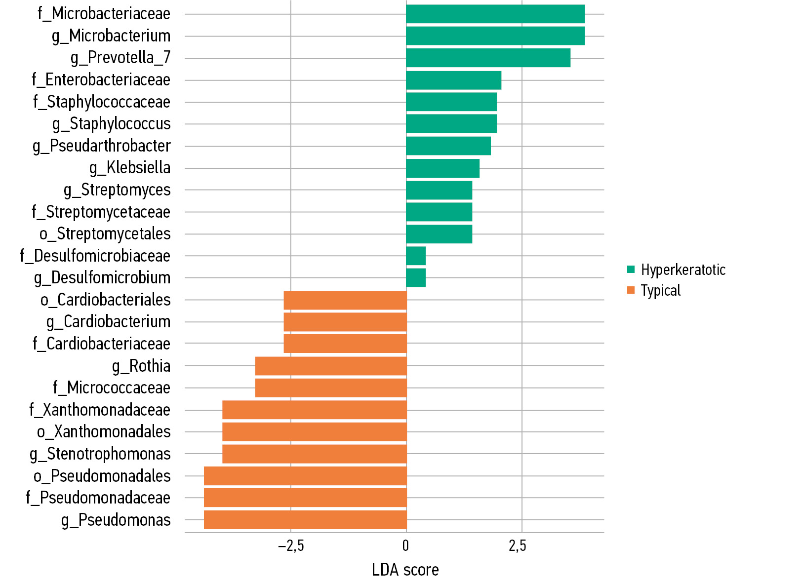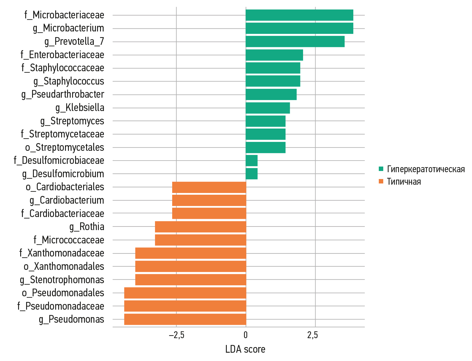 The subgroup analysis using linear discriminant analysis identified certain bacterial taxa with significantly different abundances between hyperkeratotic and typical forms, consistent with beta diversity.