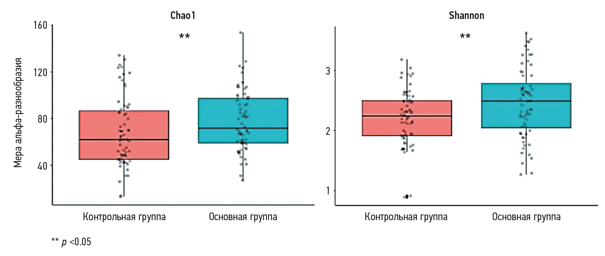 2. Fig. 1. Analysis of alpha diversity of the bacterial composition of the oral mucosa depending on the presence of the disease using the Chao1 and Shannon indices.