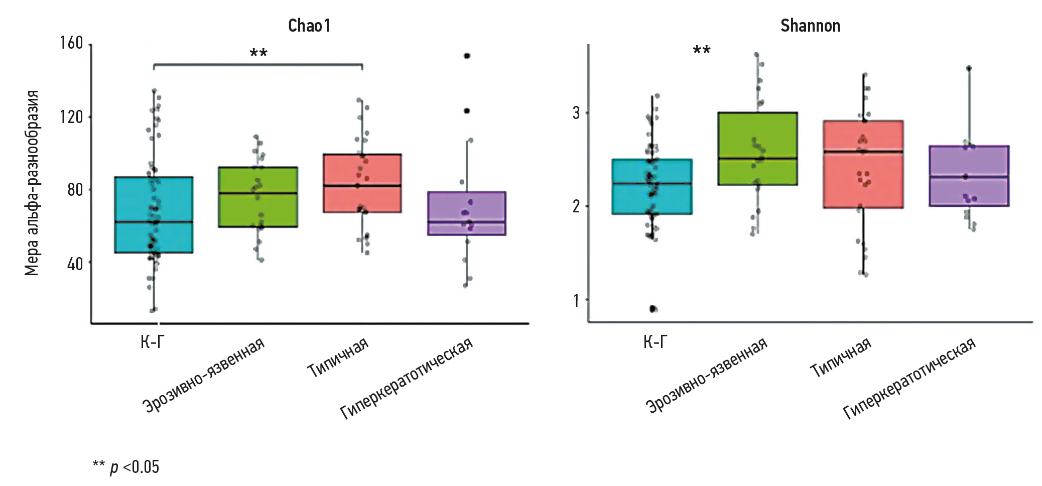 Alpha diversity analysis. The bacterial composition was more diverse in the samples of the main group (Fig. 1); however, when comparing different OLP forms, significant differences were revealed for the typical and erosive-ulcerative forms when using the Chao1 and Shannon indices in the control group samples (Fig. 2).