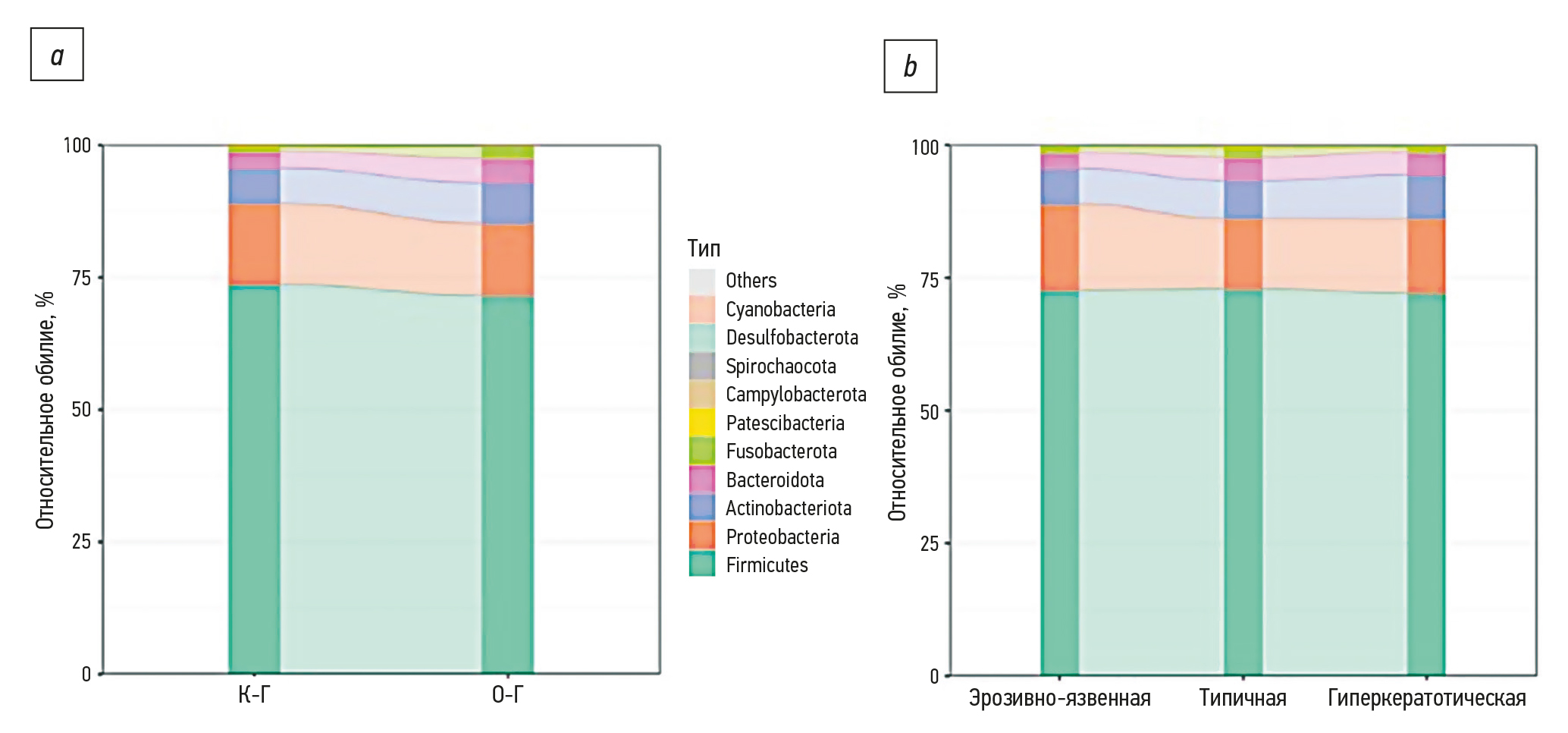 Fig. 4. Representation of the relative abundance of oral microbiota at the phylum level with comparisons between the main group (О-Г) and control group (К-Г) (a), as well as among the typical, erosive-ulcerative, and hyperkeratotic forms (b) (The 10 more frequent taxa).