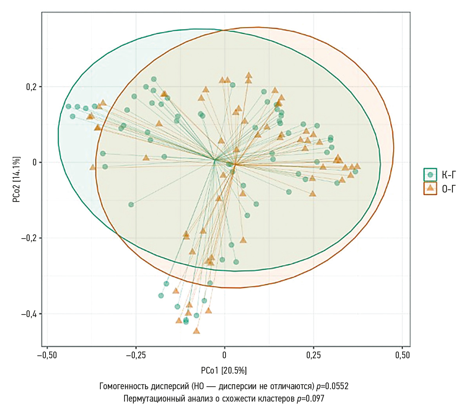 8. Fig. 7. Beta-diversity analysis of microbial community compositional differences between the main group (О-Г) and the control group (К-Г) using PCoA (Principal coordinate Analysis).