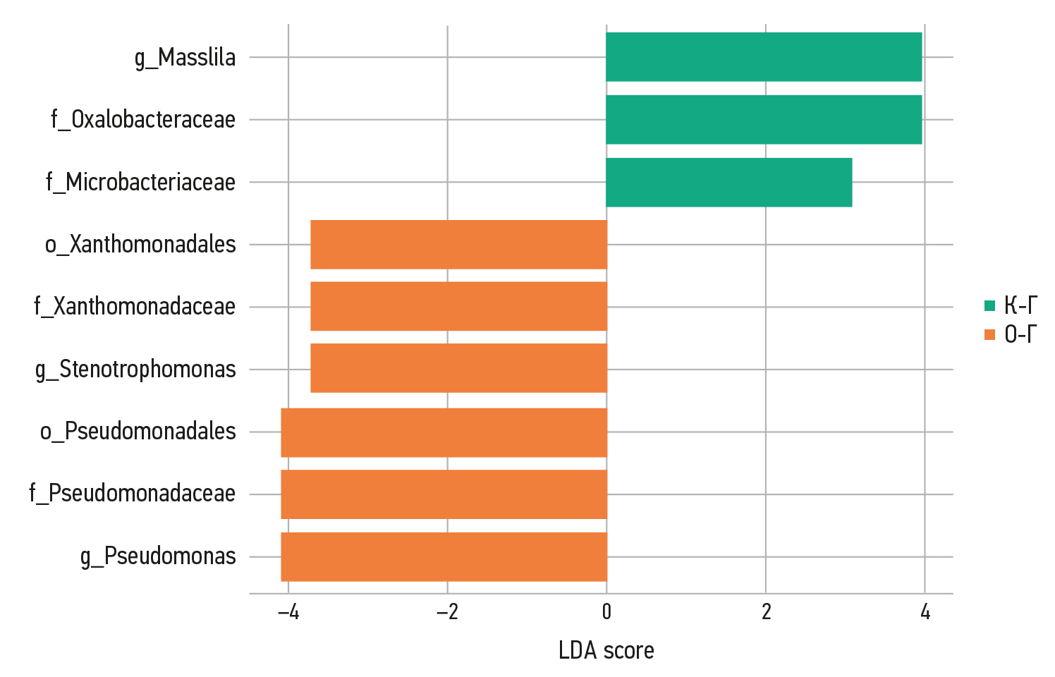11. Fig. 10. Differential abundance of amplicon sequence variants (ASV) between the main group (О-Г) and the control group (К-Г) as determined by linear discriminant analysis (LDA).
