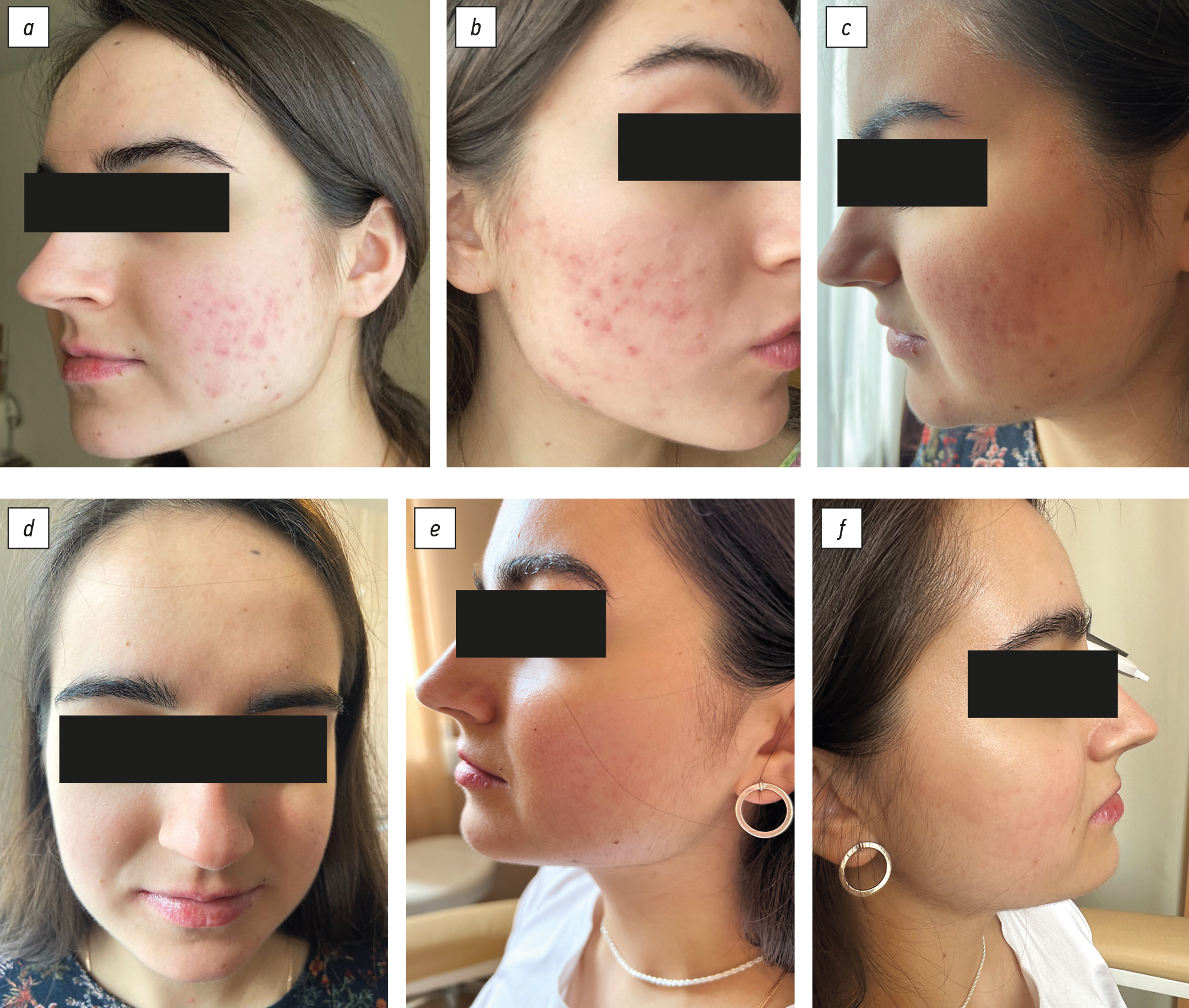 Рис. 2. Пациентка О., 17 лет, диагноз «Вульгарные акне средней степени тяжести»: a, b ― состояние кожи до лечения; c ― выраженный регресс воспалительных элементов (на 50%) через 2 недели применения крема; d−f ― полный регресс высыпаний через 7 недель лечения.