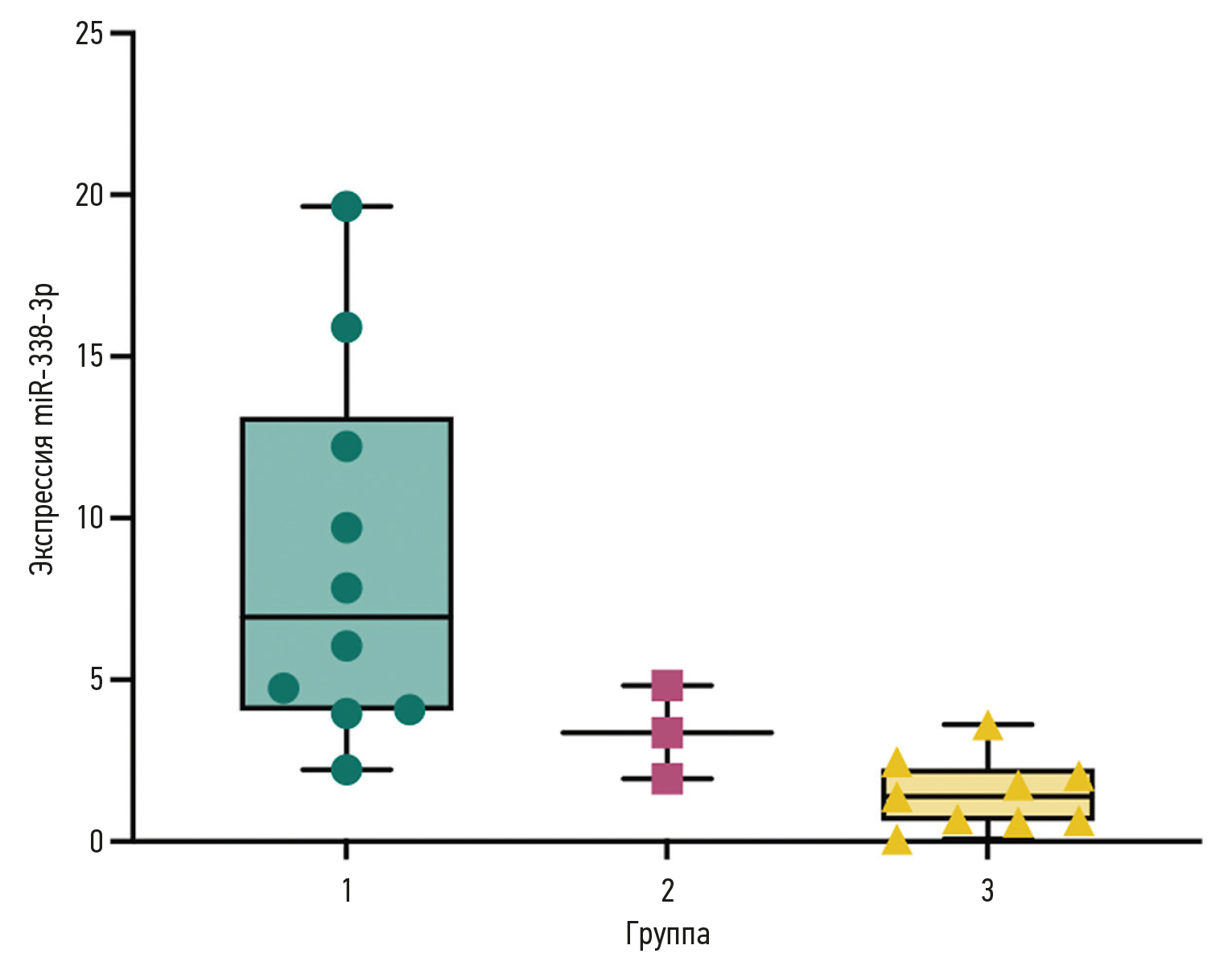 2. Fig. 1. Mean expression level of miR-338-3p. Groups: 1 ― patients with active stage of the disease; 2 ― patients in remission; 3 ― control group of healthy volunteers.