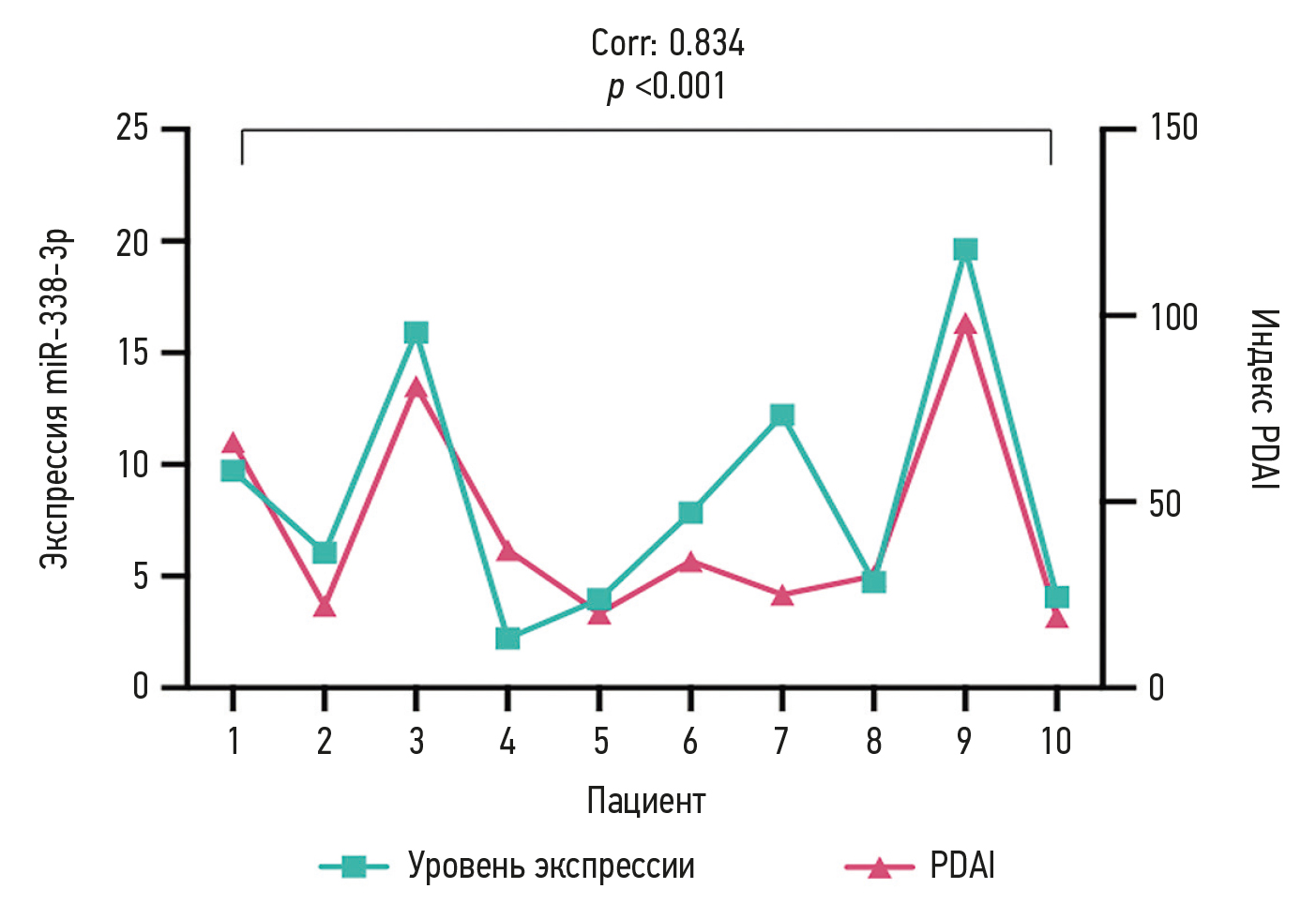 RESULTS: The expression level of miR-338-3p was analyzed in 10 patients in the active stage of the disease (5 men, 50%; 5 women, 50%; mean age 46±10.7 years), 3 patients in remission (2 women, 66.7%; 1 man, 33.3%; mean age 57±8 years), 9 control group (8 women, 88.9%; 1 man, 11.1%; mean age 36±16.8 years). The mean expression level of miR-338-3p was 8.64 (SD±5.72) in patients with active disease, 3.38 (SD±1.44) in patients in remission, and 1.48 (SD±1.12) in controls. A statistically significant increase in the expression level of miR-338-3p was found in patients in the active disease stage compared to the control group (p=0.002). A statistically significant correlation was found between the level of miR-338-3p expression and the PDAI index score (p <0.001).
