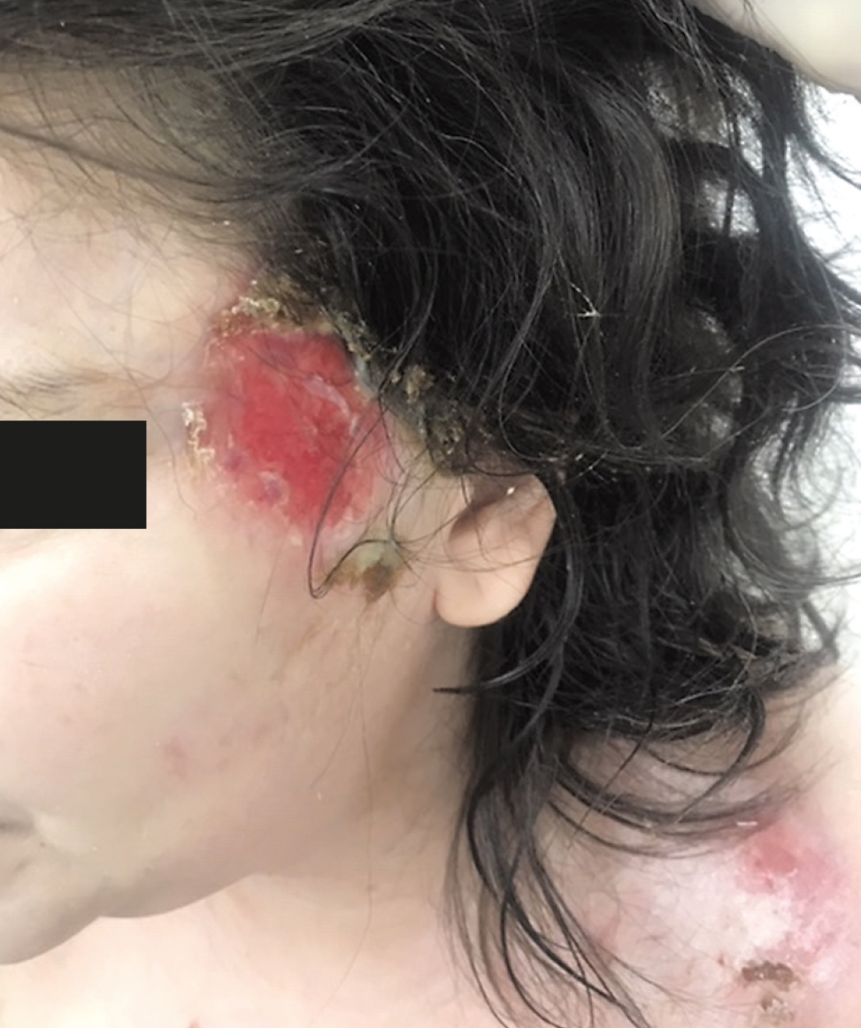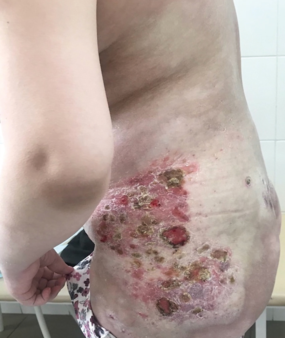 Eruptions on the skin of the left temporal region are represented by pink erosions with rounded contours, surrounded by yellow-brown crusts (Figure 1). The eruptions on the abdominal skin extend to the skin of the mammary glands and present as pink-red and greyish-white extensive areas with rounded shapes and blurred borders, measuring up to 15–20 cm in diameter. The lesion surface displays isolated bullous elements with flaccid upper layer, containing clear and serous-hemorrhagic fluid, alternating with reddish erosive areas ranging from 1 to 10 cm in diameter, the majority of which are covered with large dark brown crusts (Figure 2).