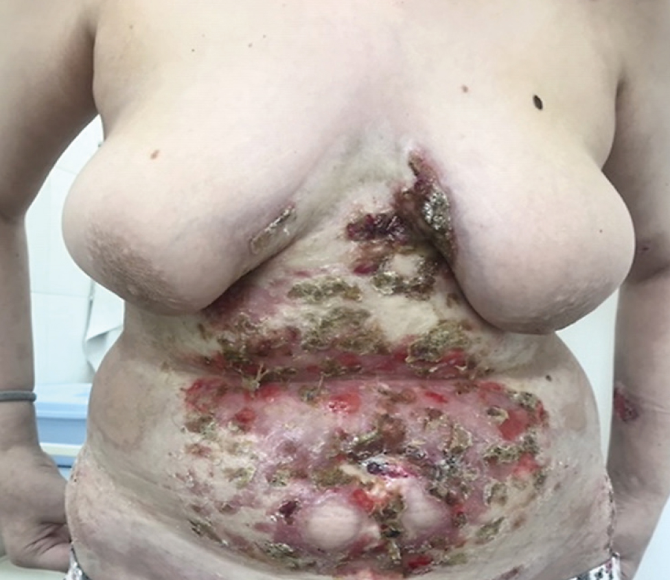 Fig. 2. Multiple foci on the skin of the abdomen and mammary glands (general view).