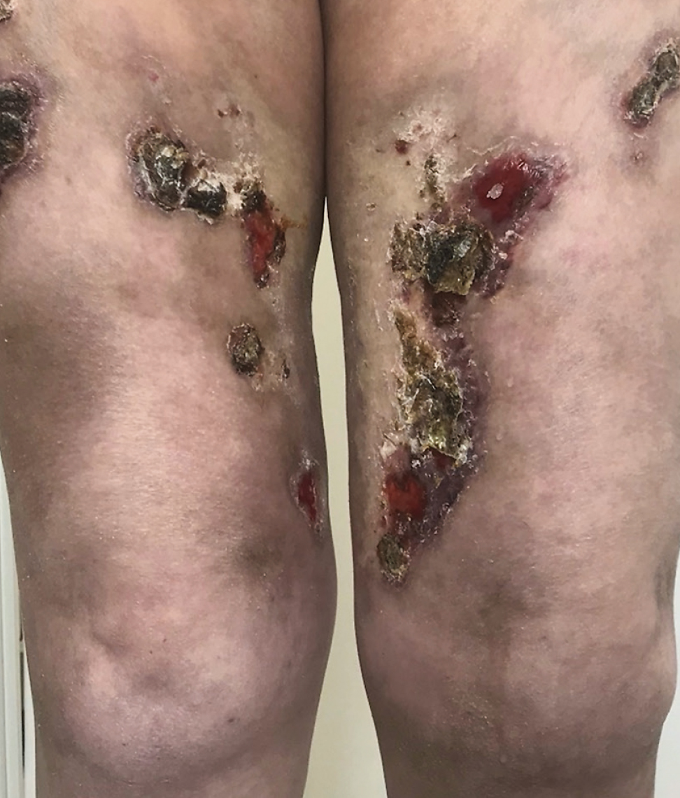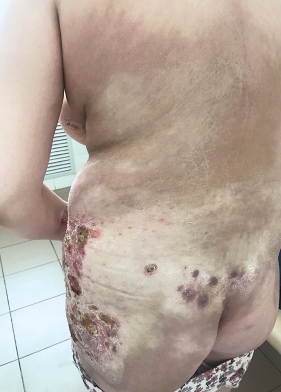 On the skin of the lateral surfaces of the thighs and partially on the buttocks and sacral region, eruptions are represented by white-pink plaques, on the surface of which there are red erosions measuring up to 5 cm in diameter with dark brown crusts at the periphery of the lesions (Figures 3, 4). On the skin of the anterior surfaces of both thighs, there are linear elongated plaques with blurred borders, on which areas of greyish atrophy, burgundy erosions, and large greyish-brown crusts alternate (Figure 5).