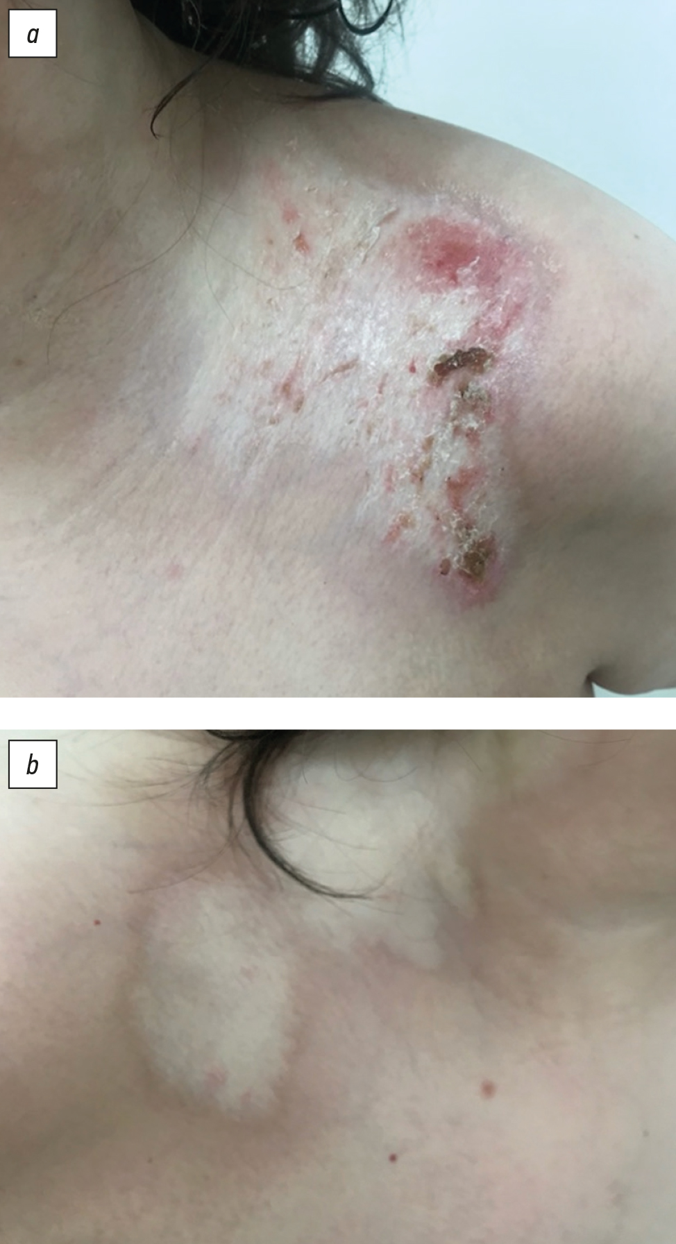 Fig. 6. Skin foci on the left shoulder (a) and right shoulder and neck (b).