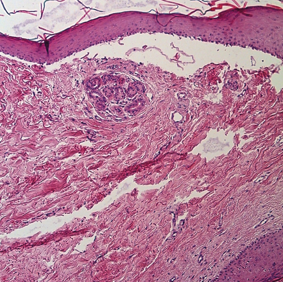 Histopathological examination: Histological examination of the skin flap biopsy revealed epidermal atrophy, focal vacuolization of basal keratinocytes, and edema of the papillary dermis, leading to the formation of subepidermal blisters. In the dermis, hyalinization and thickening of collagen bundles with subsequent sclerosis and dilation of lymphatic vessels were observed. Lymphoplasmacytic infiltrate was noted in the perivascular space and at the dermoepidermal junction (Fig. 7).