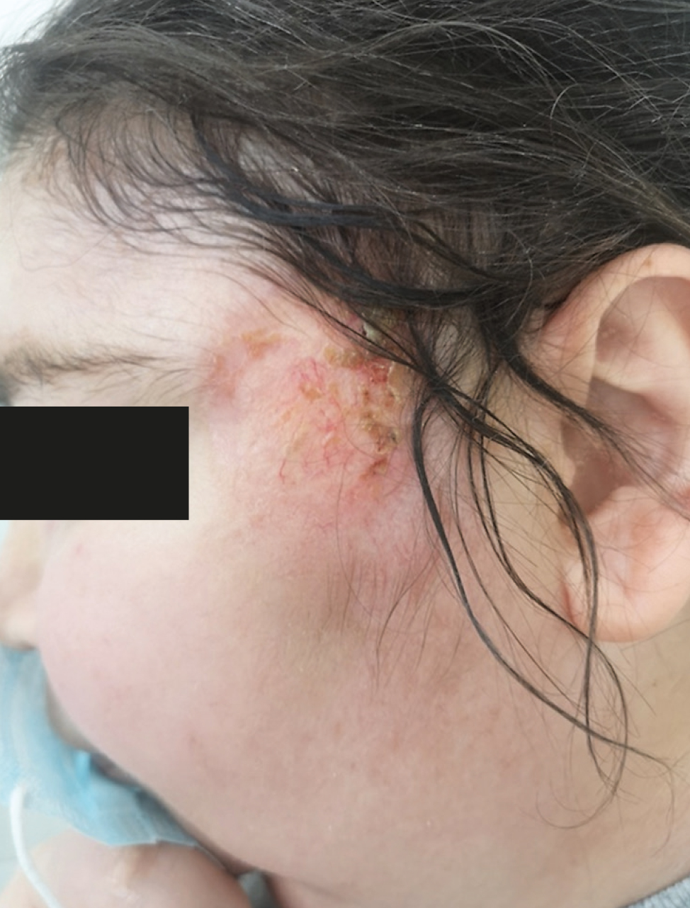 Fig. 1. Bullous scleroderma: foci on the skin of the left temporal region.