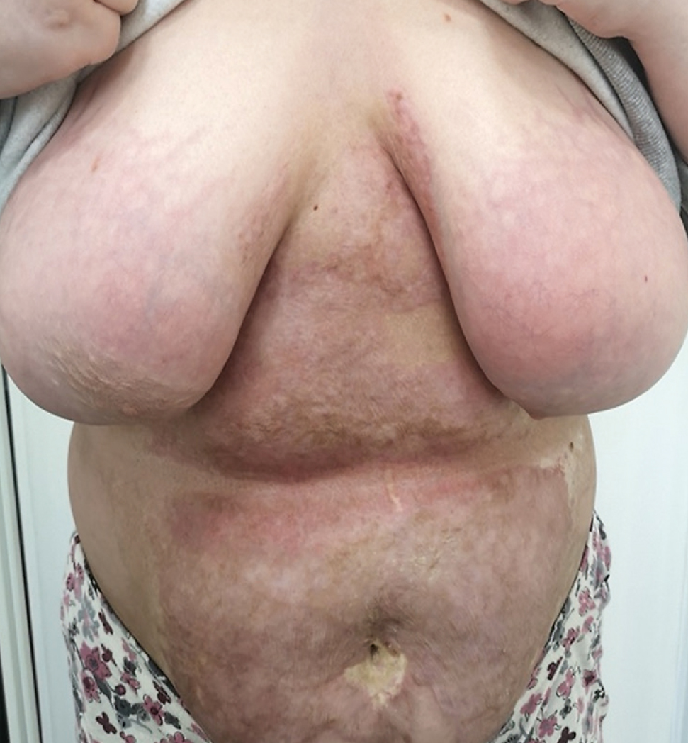 Fig. 9. Exodus of multiple foci on the abdomen and mammary glands into widespread skin atrophy with irregular edges; presence of areas of hyperpigmentation.