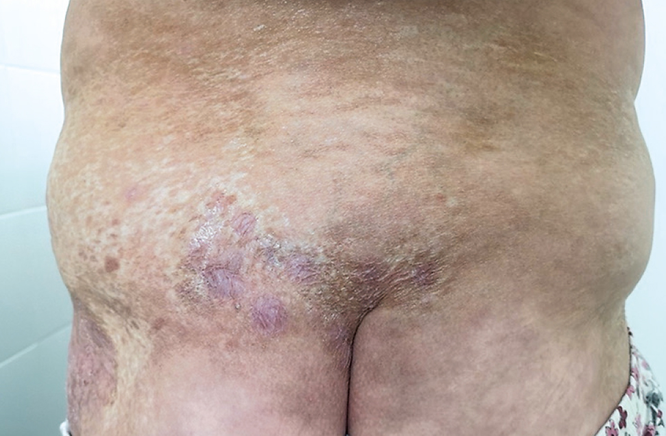 Status localis: The skin involvement is extensive and of a chronic inflammatory nature, presenting multiple lesions localized on the temporal regions, neck, abdominal skin, lower back, and thighs.