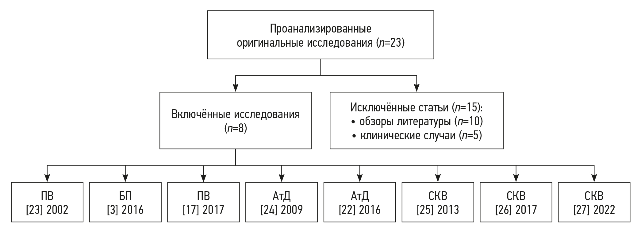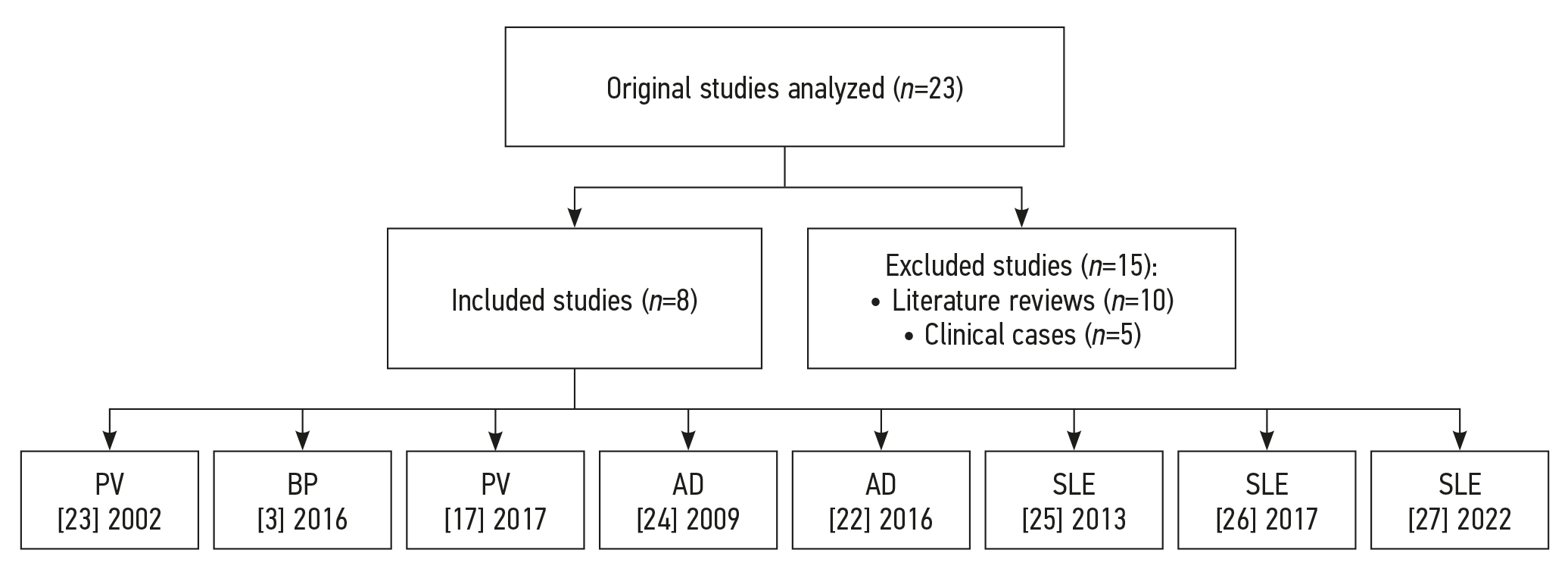 Fig. 1. Selected scientific literature for further analysis. PV: pemphigus vulgaris; BP: bullous pemphigoid; AD: atopic dermatitis; SLE: systemic lupus erythematosus.