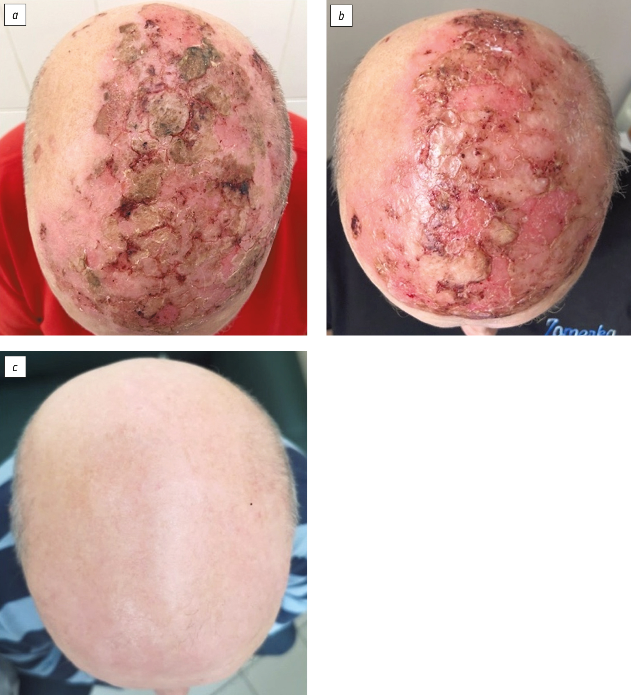 Fig. 12. Patient N., 59 years old, diagnosis of pemphigus foliaceus: before (a), against the background of (b) and after (c) treatment with systemic glucocorticoids, intravenous immunoglobulin and plasmapheresis (remission 2 years).