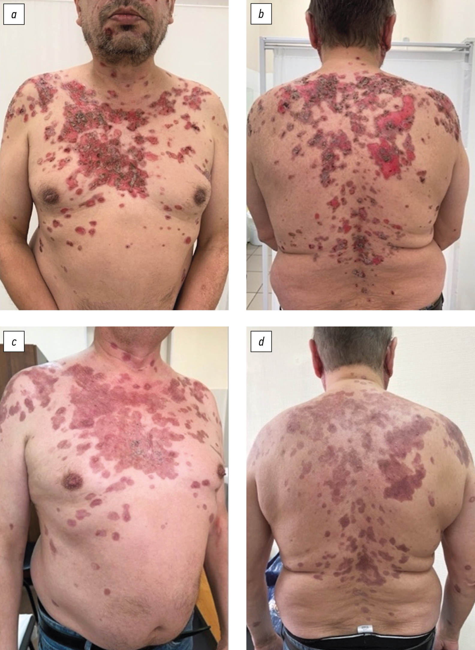 Fig. 15. Patient N., 53 years old, diagnosis pemphigus vulgaris: before (a, b) and on ongoing therapy (c, d) with systemic glucocorticoids, intravenous immunoglobulin and plasmapheresis (remission 1 year).