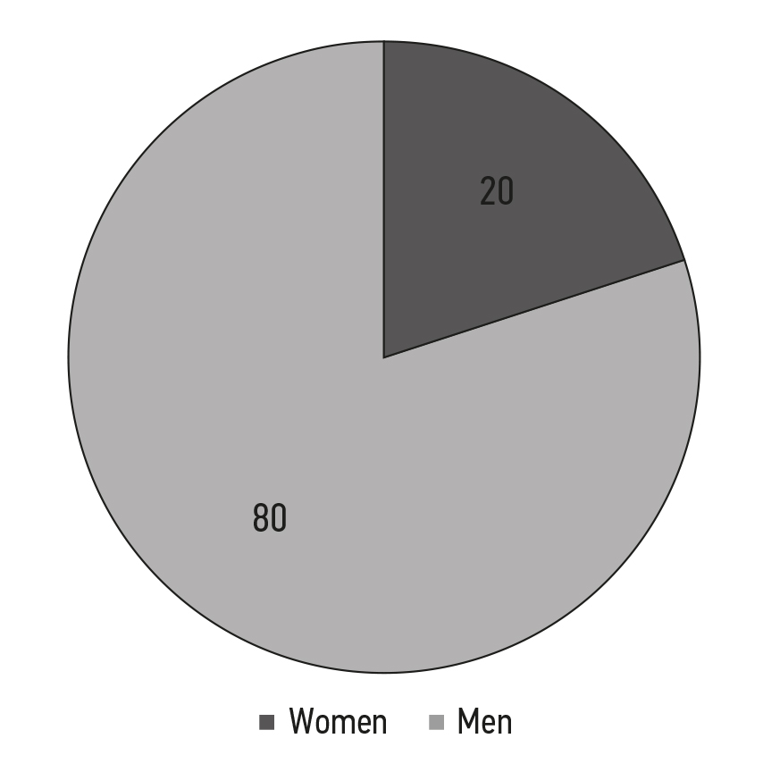 The study included patients diagnosed with AP (n=41), with a mean age of 52 years. Of these patients, 26 received SGC monotherapy, and 15 patients who were steroid-resistant received SGCs, human IVIG, and plasmapheresis. There were 80% of females and 20% of males (Fig. 2). AP was mild in 20% of patients, moderate in 40%, and severe in 40% (Fig. 3). The duration of the disease ranged from 1 to 13 years.