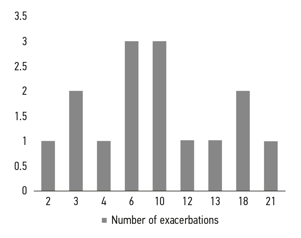 Fig. 6. Distribution of steroid-resistant patients by frequency of annual exacerbations from disease onset.