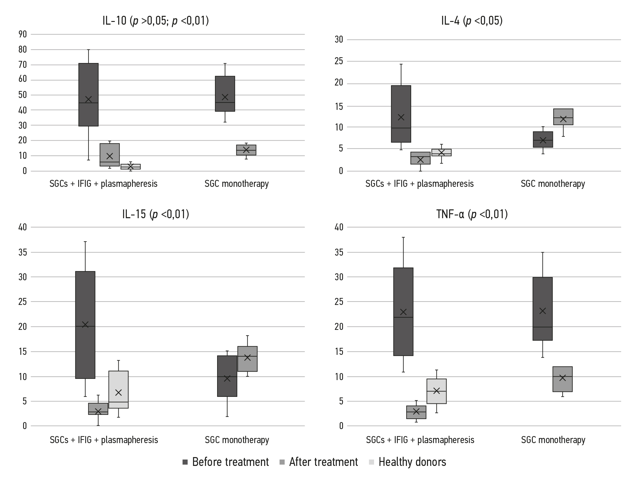 There were some differences in cytokine profile in patients of both groups during therapy. Specifically, patients who received combination therapy demonstrated a statistically significant decrease in the levels of cytokines IL-4 (Me=4 pg/mL), IL-15 (Me=3 pg/mL), and TNF-α (Me=3 pg/mL). Conversely, the SGC monotherapy group exhibited higher levels of these cytokines, with IL-4 (Me=13 pg/mL), IL-15 (Me=14 pg/mL), and TNF-α (Me=10 pg/mL) (p <0.01) (Fig. 9). Notably, IL-10 levels were significantly higher in patients with AP in both groups compared with healthy donors; however, there were no differences in IL-10 between Groups 1 and 2 (p >0.01).